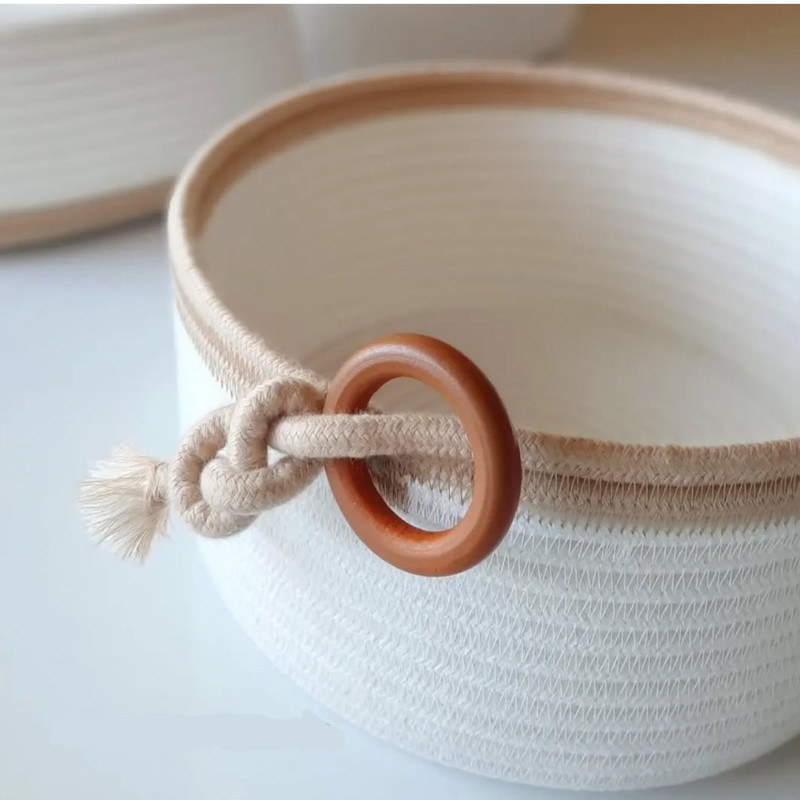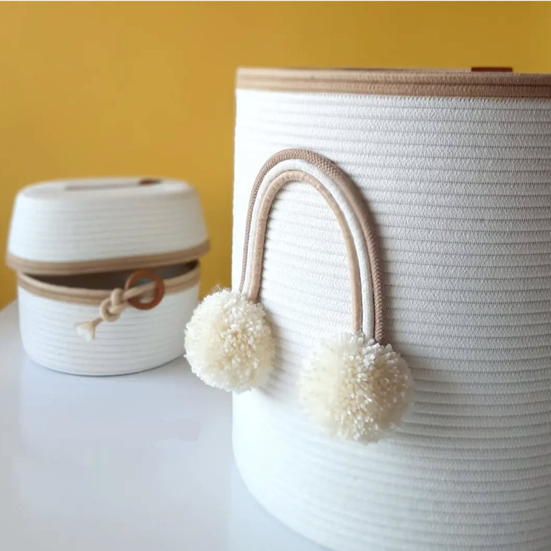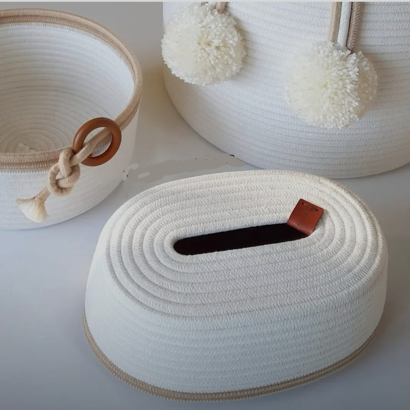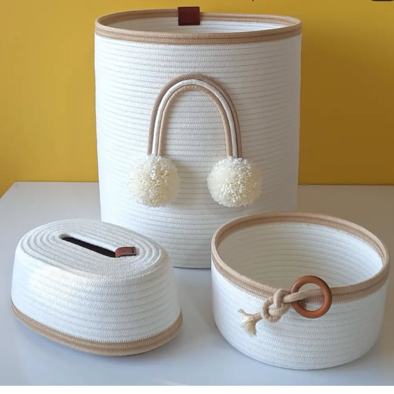 این محصول شامل یک سبد اسباب بازی ، یک سبد لوسیون و یک جای دستمال می‌باشد. سبد اسباب بازی که میتوان از ان بعنوان لاندری نیز استفاده نمود، قطر ۳۰ و ارتفاع ۳۵ سانتیمتر دارد. سبد لوسیون قطر ۲۰ و ارتفاع ۱۰ سانتیمتر دارد. این کالا با ریسمان قیطان دوخته شده و دوختی تمیز و محکم دارد، قابل شستشو در لباسشویی و یا با دست می‌باشد. در تنوع رنگ های مختلف، قسمت سفید سبدها یکسان است و رنگ انتخابی شما دو لاین آخر...