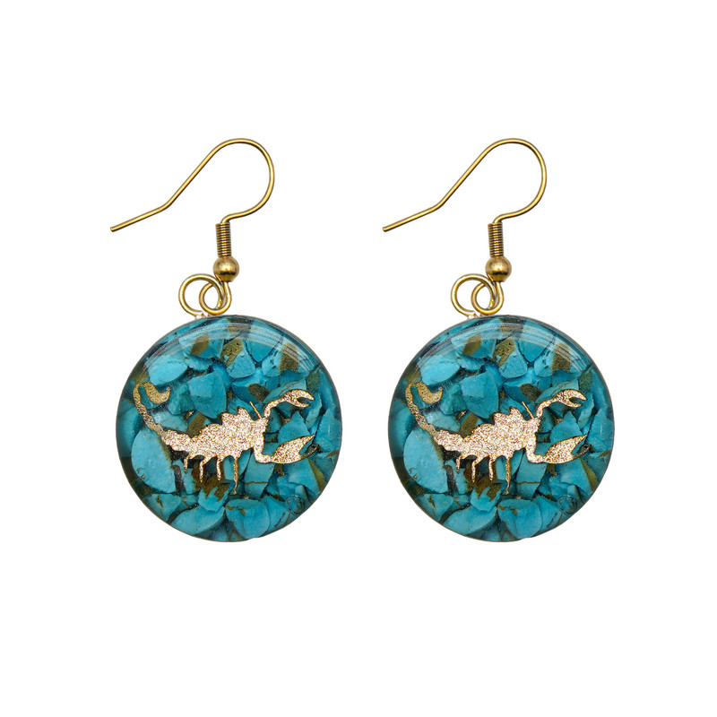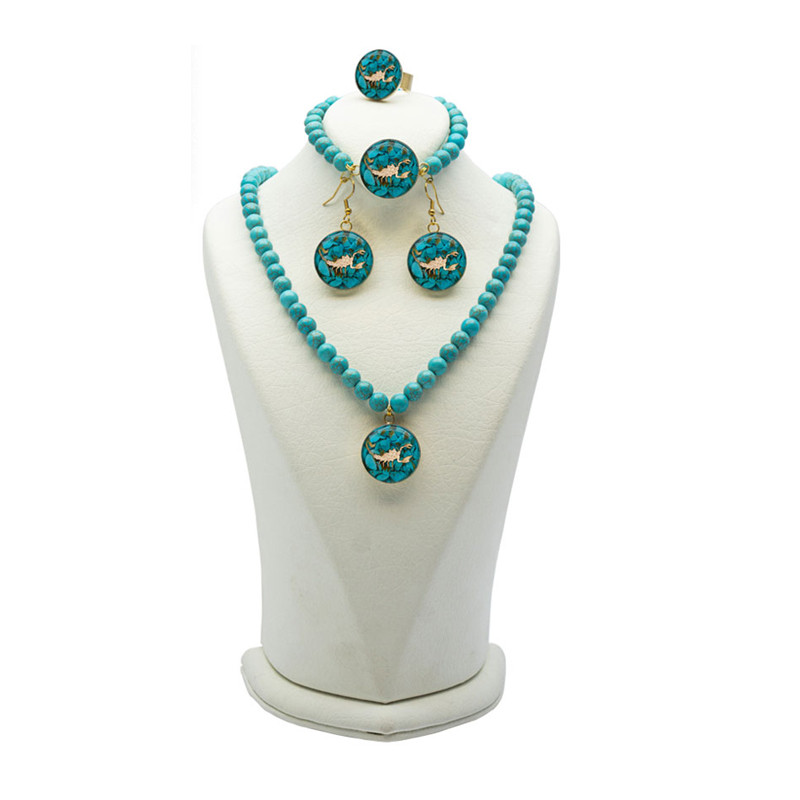 مهرههای فیروزهای، با رنگ آسمانی و آرامشبخش خود، نمادی از امید و تعادل درونی هستند. پلاکهای دایرهای با نقش عقرب، نماد ماه آبان، با ظرافت تمام از طلای با کیفیت ساخته شدهاند. تضاد رنگ فیروزهای و طلایی، جلوهای خاص و منحصربهفرد به این ست بخشیده است.