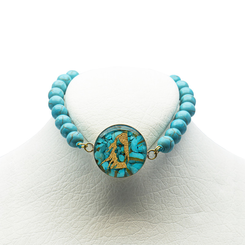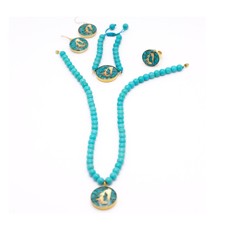 فیروزه، با رنگ آسمانی خود، آرامش و تمرکز را به ارمغان میآورد، گویی انعکاسی از ذهن سازمانیافته و دقیق متولدین شهریور است. روکش طلا، با درخشش بینظیر خود، جلوهای لوکس و ماندگار به این ست میبخشد. پلاکهای منقش به نماد ماه شهریور (بانوی خوشه گندم)، با ظرافت تمام طراحی شدهاند، گویی هر خط و انحنا، حکایت از ذوق هنری و توجه به جزئیات دارد.