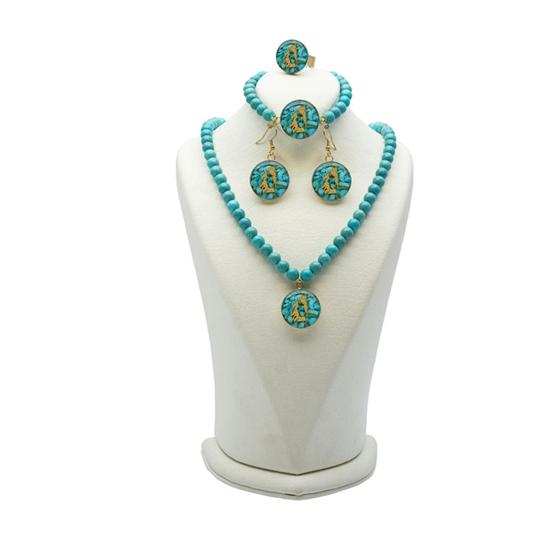 ست کامل جواهرات شهریوری، داستانی از ترکیب سنگ فیروزه و روکش طلا با ضخامت 5 میکرون است. این مجموعه، شامل گردنبند، دستبند، انگشتر و گوشواره، با طراحی مینیمال و چشمنواز، ظرافت و در عین حال استحکام را به نمایش میگذارد.