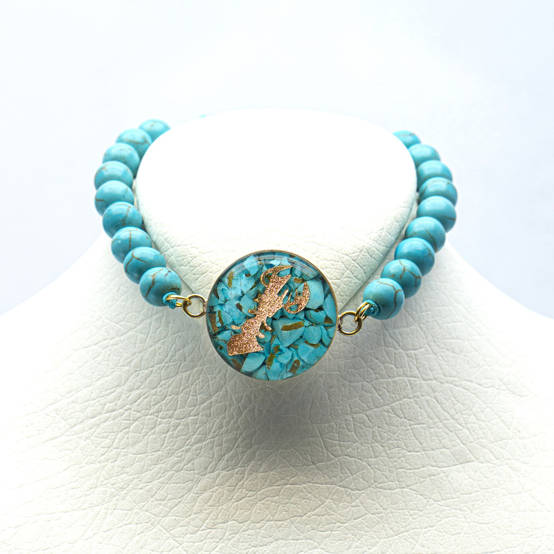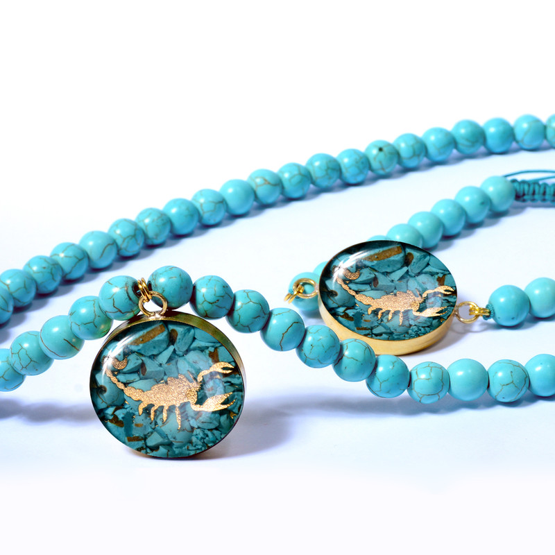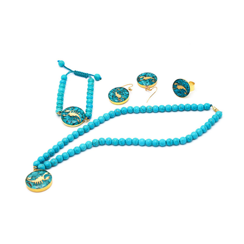 ست ماه تولد یکی از زیبا ترین محصولات دستساز می باشد که در آن با ترکیب دانه های فیروزه و سمبل ماه تولد روکش طلا باکیفیت ، این اثر جذاب تولید شده است. این محصول کاملا دست ساز میتواند هدیه ای با ارزش برای یک دوست و یا همراه باشد . تمام تلاش ماخلق زیبایی های است ماندگار و متفاوت برای کسانی که طالب داشته هایی منحصر به فرد اند . فیروزه سنگ نسبتا حساسی است و نباید با مواد آرایشی، عطر و یا مواد شیمیایی در تماس باشد. چنانه این اتفاق افتاد بهتر است بلافاصله با آب ولرم خوب شستشو داده شود. سمبل آبان ماه یعنی علامت عقرب ساخته شده از روکش طلای 24 عیار که درخشندگی خیلی محسور کننده ای به گردنبند می بخشند. گردنبند و دستبند " ماه تولد" با ورق طلای 24 عیار روکش شده و دقت بسیار بالایی در ساختار بدنه و نگین دارد . یکی دیگر از ویژگی های این محصول زنجیر آن است که کیفیت بالایی دارد و طول آن 46سانتی متر است و براحتی می توان روی لباس های بیرون استفاده کرد تا کامل چشم نوازی کند.ولی بیشتر از داخل لباس یعنی بصورت گردنی استفاده میشود گوشواره و انگشتر محصولات جدیدی هستند که به تازگی به این ست اضافه شده اند و زیبایی آن را چند برابر کرده اند.