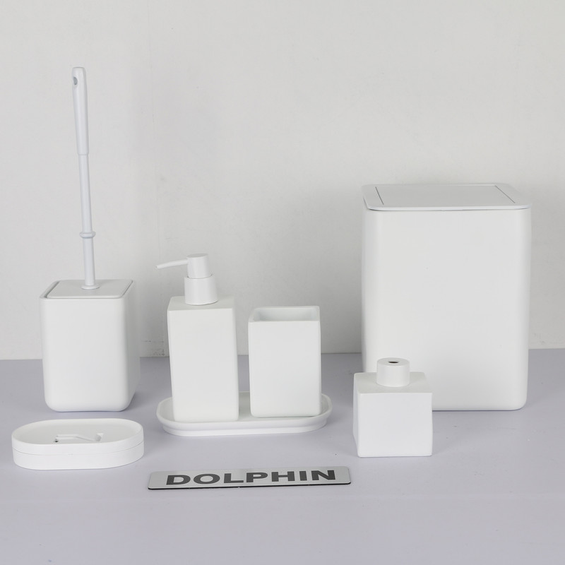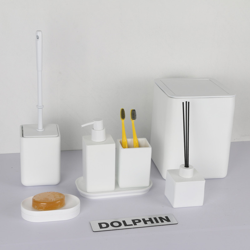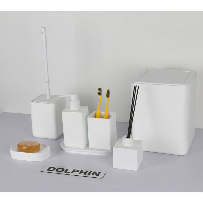 ست سرویس بهداشتی دکوراتیو دلفین از پلی رزین درجه یک ساخته شده است. ست دلفین تشکیل شده از، جای صابون، جای مسواک، سطل، توالتشور، جای مایع، و ظرف خشبوکننده به همراه سینی میباشد. ست رومیزی دلفین ضد زنگ و ضد باکتری است که مزیت بزرگی در سرویس بهداشتی است. طراحی مینیمال این محصول دلفین مناسب برای هر دکوری در سرویس بهداشتی میباشد. این محصول مناسب برای هدیه، جهیزیه و ایجاد یک دکور زیبا وایدهآل میباشد.