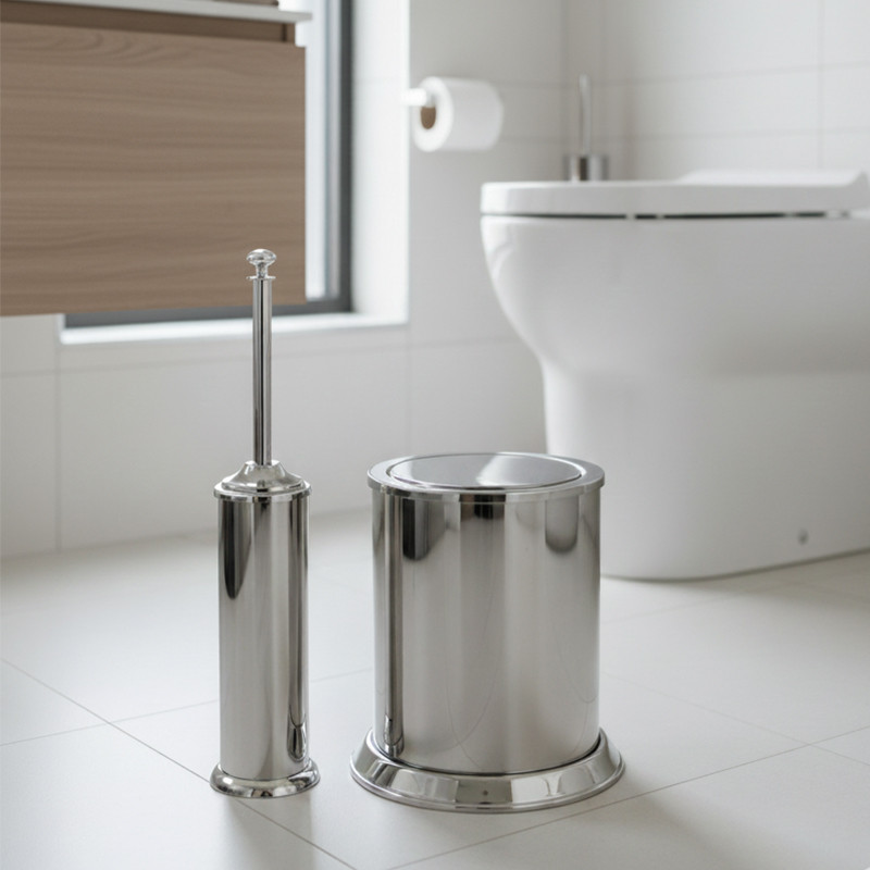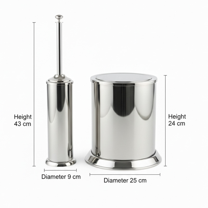 سطل و فرچه دلفین از جنس استیل براق با طراحی مدرن و مقاوم، انتخابی ایده‌آل برای سرویس بهداشتی است. این ست شامل یک سطل زباله با ارتفاع 24 سانتی‌متر و قطر 25 سانتی‌متر با درب بادبزنی روان و بی‌صدا، و یک فرچه با ارتفاع 43 سانتی‌متر و قطر 9 سانتی‌متر برای نظافت آسان و بهداشتی است. ساختار استیل ضدزنگ آن علاوه بر مقاومت بالا در برابر رطوبت، جلوه‌ای شیک و مینیمال به فضا می‌بخشد و به‌راحتی تمیز می‌شود. طراحی یکدست و انعکاس ظریف نور روی سطح براق، این مجموعه را به ترکیبی کاربردی و زیبا برای هر دکوراسیون تبدیل کرده است.