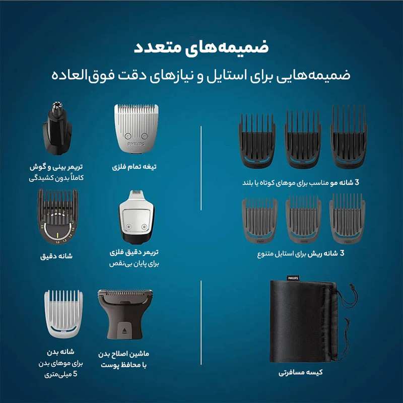 ماشین اصلاح فیلیپس مدل MG7920 از تولیدات جدید و پیشرفته سری 7000 تریمرهای فیلیپس میباشد که با تغییرات اندکی نسبت به مدل قبل از خود MG7910 روانه بازار شده است . سری 7000 تریمرهای فیلیپس کاربردی ترین و پرفروشترین دستگاه های چندکاره فیلیپس میباشند. کیفیت ساخت این مدل بالا میباشد بدنه فلزی با روکشی از کروم پرداخت شده ظاهری زیبایی به ماشین اصلاح داده است که با در دست گرفتن آن حس کیفیت را منتقل میکند ....