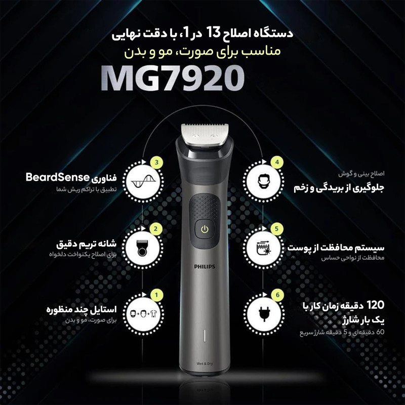 ماشین اصلاح فیلیپس مدل MG7920 از تولیدات جدید و پیشرفته سری 7000 تریمرهای فیلیپس میباشد که با تغییرات اندکی نسبت به مدل قبل از خود MG7910 روانه بازار شده است . سری 7000 تریمرهای فیلیپس کاربردی ترین و پرفروشترین دستگاه های چندکاره فیلیپس میباشند. کیفیت ساخت این مدل بالا میباشد بدنه فلزی با روکشی از کروم پرداخت شده ظاهری زیبایی به ماشین اصلاح داده است که با در دست گرفتن آن حس کیفیت را منتقل میکند . موتور این دستگاه به سنسور هوشمندی مجهز شده که در هر دقیقه بارها سطح پوست را برای تشخیص تراکم و ضخامت مو اسکن میکند و قدرت متناسب را تنظیم مینماید. این دستگاه ضد آب بوده و امکان اصلاح خشک ، تر یا با فوم را دارد . زمان شارژ باطری دستگاه 60 دقیقه میباشد و امکان استفاده تا 120 دقیقه را فراهم مینماید و قابلیت شارژ سریع 5 دقیقه ای را نیز دارد. اندازه اصلاح تیغه اصلی 0.5 میلی متر میباشد و با شانه های متنوع در سایزهای بالاتری اصلاح میکند . این مدل بجز تیغه اصلی دارای 3 سری دیگر میباشد: سری موزن گوش و بینی ، سری اصلاح بدن (بادی گروم) و سری اصلاح جزئیات ضمنا دارای 3 عدد شانه برای اصلاح سر ، 3 عدد شانه برای اصلاح صورت ، 1 عدد شانه برای اصلاح بدن و یک عدد شانه Precision Comb چند سایزه میباشد و نیز دارای کاوری برای نگهداری دستگاه و اقلام همراه میباشد. از مزیتهای دستگاه تیغه خود تیز شونده ی آن میباشد که نیازی به روغنکاری ندارد و بعد از چند سال استفاده مانند روز اول تیز میماند. از ملاحظات باطری دستگاه و کلا برای ماشین اصلاح هایی با مشخصات یکسان این مورد میباشد که هر چه از شارژ سریع کمتر استفاده شود و قبل از اتمام شارژ حتما شارژ شود باعث بالا رفتن طول عمر باطری دستگاه میباشد. در مقایسه با مدلهای دیگر سری 7000 (شامل 7770-7750-7735-7720-7715 ): دو مدل MG7920 – MG7910 پیشرفته ترین دستگاه های این سری هستند که جزء مدلهای سنسور دارد میباشند که با وجود قیمت مناسب به سنسوردستگاههای گرانقیمت فیلیس مجهز شده اند و در مقایسه با مدل MG7910 نیز تولید جدید با سنسور پیشرفته تر و تم طراحی جدید فیلیپس میباشد. در پایان چنانچه قصد خرید تریمر چندکاره برای ته ریش گذاشتن و کوتاه کردن موی سر و بدن از برندهای معتبر را دارید با توجه به مشخصات این دستگاه و قیمت مناسب آن این مدل انتخاب ایده آلی میباشد.