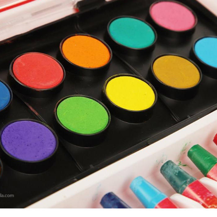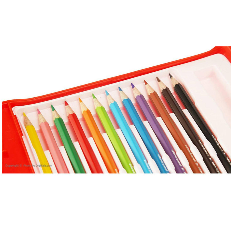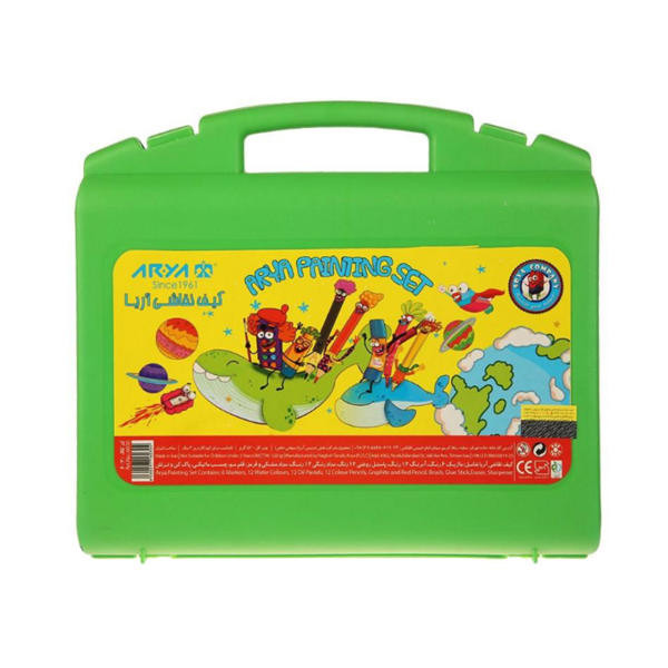 اقلام همراه | - 12 عدد مداد رنگی - 12 عدد پاستل - 12 عددابرنگ - 6 عدد ماژیک - یک عدد مداد مشکی - یک عدد مداد قرمز - دو عدد مداد تراش - یک عدد پاک کن - یک عدد قلم مو گواش - یک عدد چسب ماتیکی |