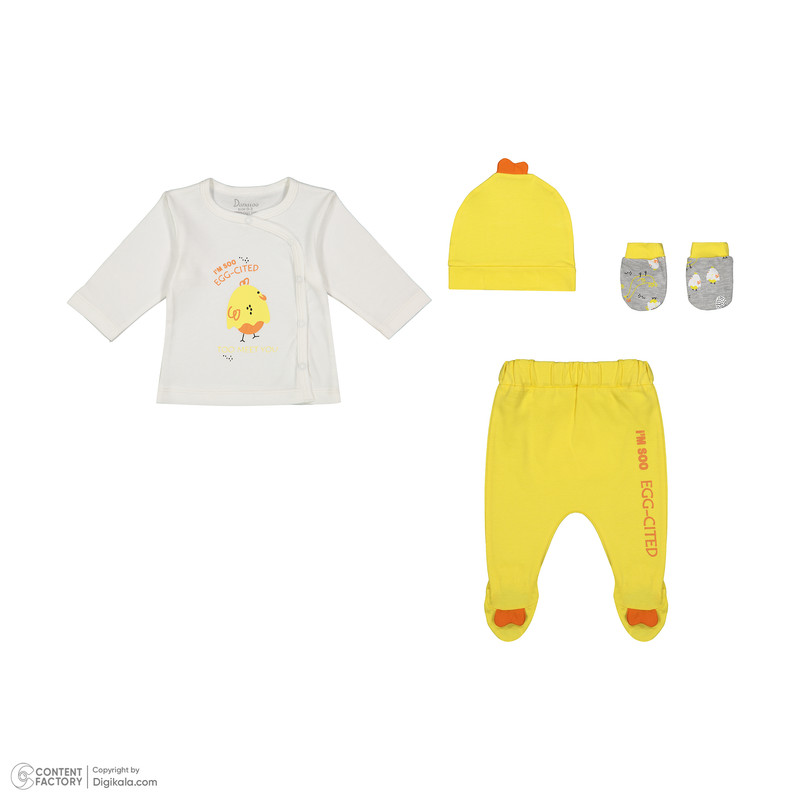 جزئیات | این ست شامل بلوز آستین بلند، شلوار جوراب دار، کلاه و دستکش نوزادی است. |