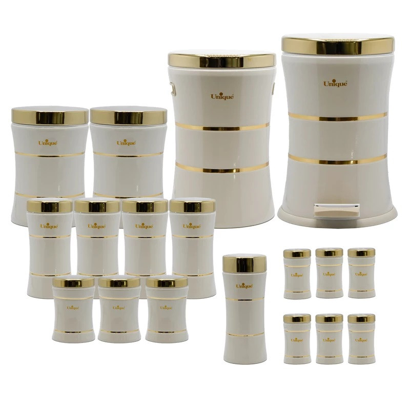 سرویس آشپزخانه 18 پارچه از جنس فلز ضد زنگ شامل قوطی های بسیار با کیفیتی است که در اندازه های مختلف تولید شده اند. میتوانید از این قوطی ها برای نگهداری حبوبات، برنج، قند و شکر، ادویه جات و … استفاده کنید. همچنین این سرویس دارای یک سطل زباله بزرگ می باشد که از یک بدنه فلزی و یک سطل داخلی قابل جدا شدن از جنس پلاستیک تشکیل شده تا شستشو ی آن آسان باشد. سطل داخلی دارای یک دسته استیل است و به راحتی بیرون می آید. برای باز کردن درب این سطل یک پدال در نظر گرفته شده و درب آن به صورت آرام بسته می شود. این سرویس شامل: سطل زباله ، سطل برنج ، 2عدد سطل بزرگ قند و شکر ، 4 عدد بانکه 1.5کیلویی حبوبات ، 3عدد بانکه 1کیلویی پاسماوری ، 6عدد بانکه کوچک جا ادویه و 1عدد بانکه استوانه ای برای نگهداری ماکارونی می باشد.