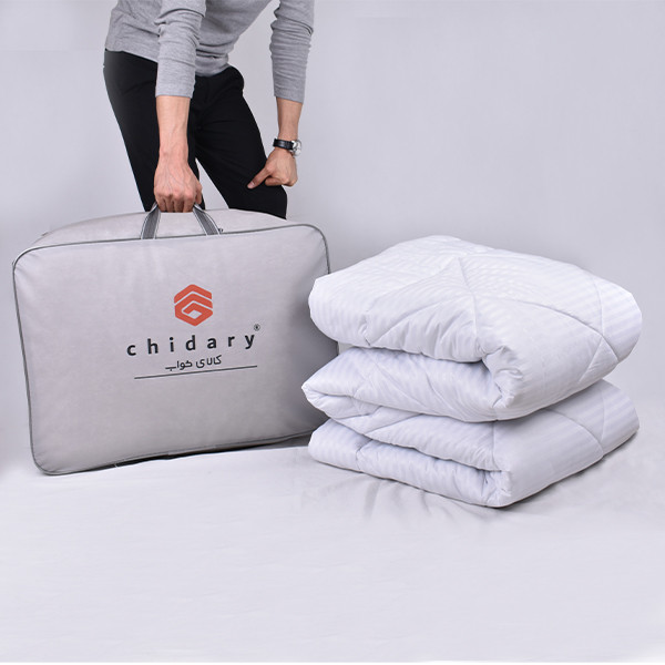 این سرویس روتختی یک نفره دارای لحاف میباشد، به این صورت که الیاف توسط دستگاه مجهز CNC به کاور پوششدهنده دوخته میشود و قابل جداشدن نیست. لحاف به دلیل داشتن دوخت CNC بسیار مستحکم و قابل شستشو میباشد. بهتر است لحاف جهت شستشو به خشکشویی داده شود. این لحاف دارای لایهی 400 گرمی و جزو دسته لحافهای ضخیم میباشد. الیاف مورد استفاده در این لحاف جزو بهترین الیاف موجود در بازار ( ملقب به الیاف سُر ) میباشد که فوقالعاده نرم، لطیف و ضدحساسیت است. این سرویس روتختی دونفره چیداری با پارچه هتلی راهراه که ترکیبی از ساتن پنبه میباشد، تولید و تهیه شده است. پارچه هتلی یکی از محبوبترین و شناختهشده ترین پارچههای موجود در بازار کالایخواب میباشد که در هتلها مورد استفاده قرار میگیرد. این پارچه علاوهبر لطافت بالا، به دلیل استفادهی درصد کمی از الیاف پلیاستر ضد حساسیت پوستی میباشد.