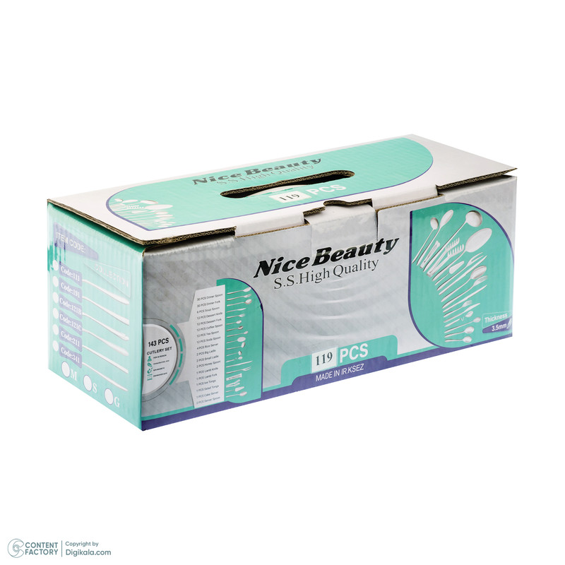 سرویس قاشق چنگال 125پارچه نایس بیوتی ( Nice Beauty ) تمام نیازهای شما را برطرف می کند.وجه تمایز این سرویس که به جرات میتوان گفت یکی از بهترین ست های کاربردی،اصولی وبا کیفیت موجود در بازار نسبت به برند های دیگر میباشد ،ضخامت 3٫5 میلیمتر واقعی باطراحی مدل های روز اروپایی است که پولیش عالی و با کیفیت این محصول، سهم چشم گیری در انتخاب این محصول به مشتریان خاص پسندش میدهد، لازم به ذکر است،این محصول با ظاهری زیبا و چشم نواز با رنگ براق خود زیبایی و شکوه خاصی به پذیرایی شما می دهد و تجربه پذیرایی ماندگاری را برای شما به ارمغان می آورد . این سرویس 18نفره از نوع بهترین استیل کروم نیکل10/18 جهان ساخته شده وکاملا ضد زنگ وضد سیاه شدگی و قابل شستشو در ماشین ظرفشویی می باشد. کاردهای میوه خوری سه بعدی این ست ،فوق العاده تیز میباشد که براحتی پوست میوه ها را جدا میکند و با طرح دسته 3 بعدی بسیار خوش دست میباشد و اقلام دیگر آن نیز چنین میباشد و شما را بی نیاز از هر گونه خرید اضافه می نماید.