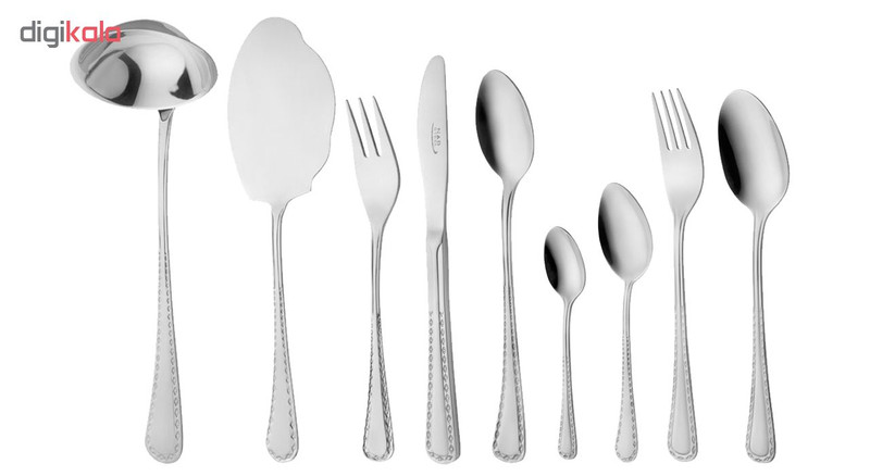 سایر توضیحات | - مناسب برای 12 نفر - 12 عدد قاشق غذاخوری - 12 عدد چنگال غذاخوری - 6 عدد قاشق چایخوری - 6 عدد قاشق مرباخوری - 6 عدد قاشق شربتخوری - 6 عدد کارد میوهخوری - 6 عدد چنگال میوهخوری - 2 عدد کفگیر - 1 عدد ملاقه |