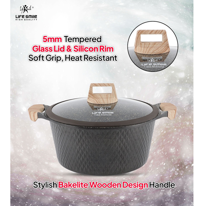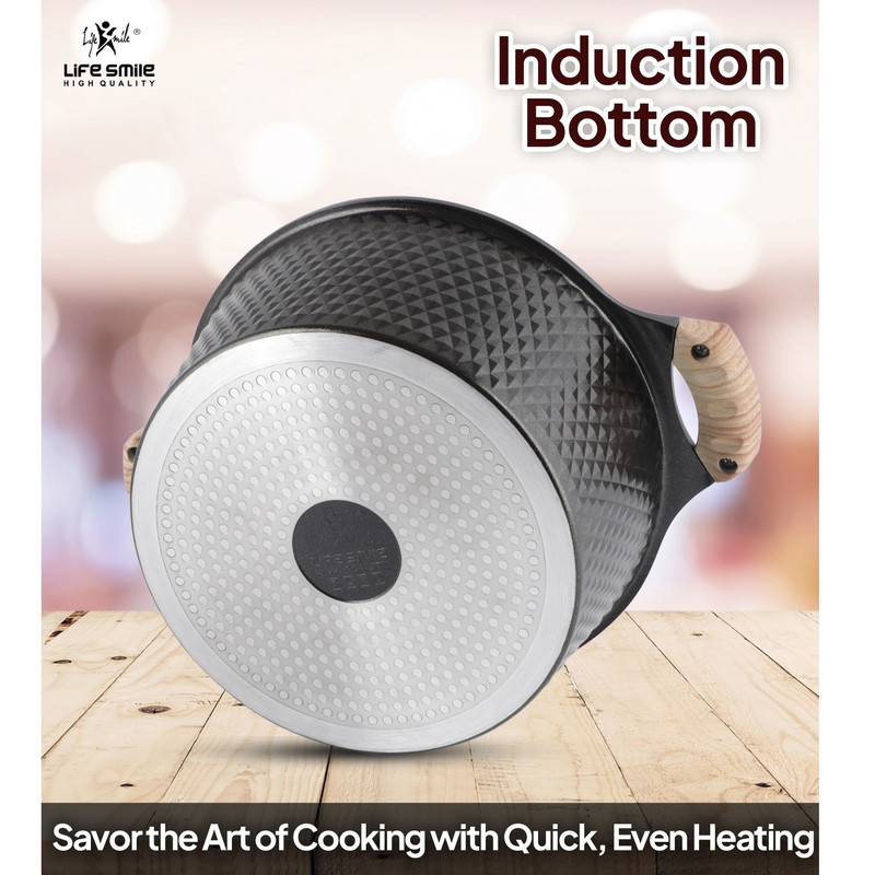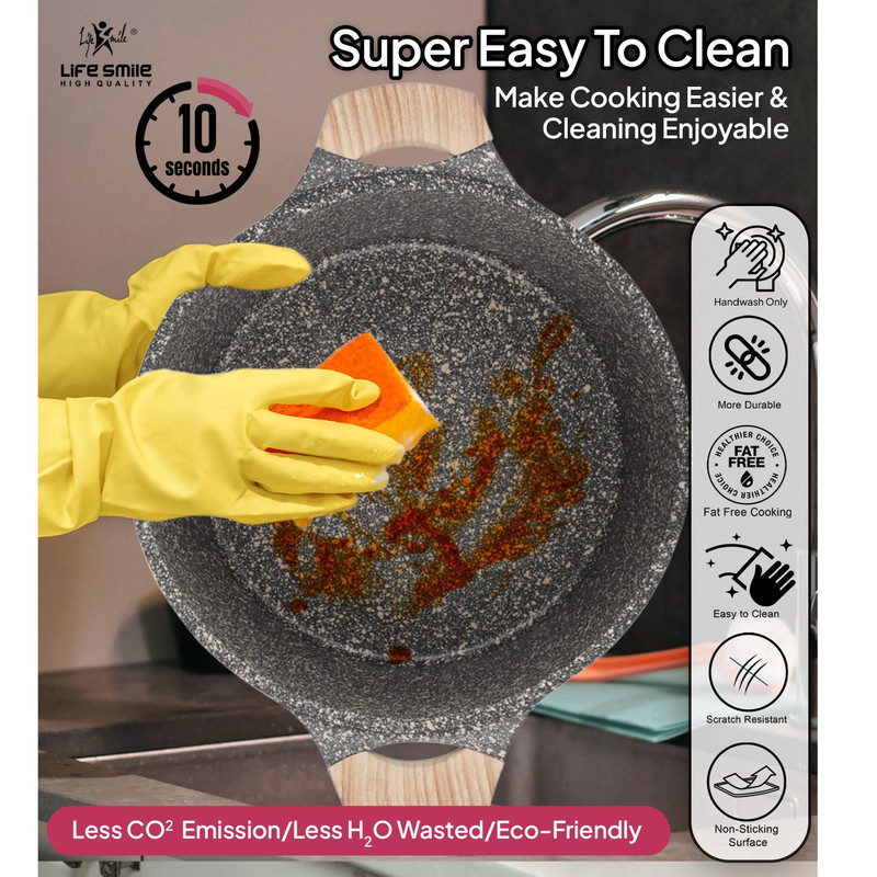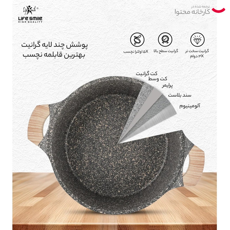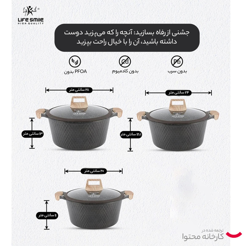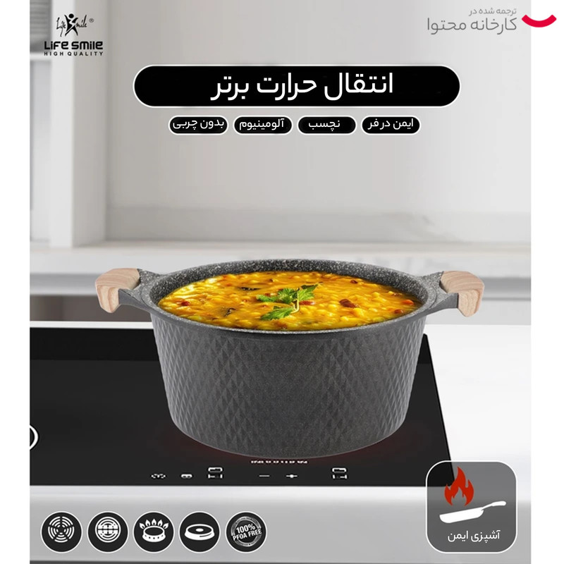 | سایر توضیحات | سطح داخلی قابلمه نچسب بادوام ساخته شده از پوشش نچسب گرانیت 100% بدون PFOA. تمیز کردن آن را آسان می کند و احتمال چسبیدن غذا به سطح را به حداقل می رساند. پوشش آن را بادوام تر می کند و دیگر لازم نیست نگران لکه شدن یا باقی مانده های دائمی باشید. سطح نچسب به شما امکان می دهد با حداقل مقدار کره/روغن/چربی بپزید و غذا را بسیار سالم تر می کند.پخت و پز با تهویه بخار: کاسرول ما با درب شیشه ای با ضخامت 5 میلی متر با طراحی تهویه بخار و با لبه استیل خالص ارائه می شود. کاسرول را به راحتی با دسته دوبل بلند کنید. طراحی تهویه بخار برای امکان دقت و کارایی زمانی که شما به آن نیاز دارید تا متناسب با وظایف آشپزی شما باشد. کف قابلمه القایی: برای استفاده در انواع اجاق گاز مناسب است. مناسب برای اجاقها و اجاقهای پخت چندمنظوره: اجاق گاز / گاز / سرامیک / اجاق گاز القایی و اجاق گاز و مایکروویو. در اینجا یکی دیگر از مزایای آلومینیوم وجود دارد: به سرعت و به طور یکنواخت گرم می شود، بنابراین شما با "نقاط داغ" مواجه نمی شوید.تمیز کردن آسان: فقط با دست بشویید. دارای سطح عالی حتی سرسختترین مواد مانند قارچهای ورقهای نازک یا پیاز خلالشده بلافاصله بدون باقی ماندن باقیمانده میلغزند. علاوه بر این، کناره های این ماهیتابه دارای انحناهای پهنی در قسمت پایینی آن است که هم زدن غذا و مخصوصاً تمیز کردن قابلمه را بعد از استفاده آسان می کند. ماهیتابه به آرامی به سمت پایین خم می شود و گرفتن آخرین ذره سس یا هر چیز دیگری (و تمیز کردن) را آسان می کند! گوشه ای برای گیر کردن غذا وجود ندارد. بدنه آلومینیومی مستحکم: توزیع سریع و یکنواخت حرارت را تضمین می کند، کف ضخیم 6 میلی متر توزیع پایدار گرما را در حین پخت فراهم می کند، به سرعت گرم می شود، در زمان و انرژی صرفه جویی می کند، ضخامت بدنه آلومینیومی با وزن مناسب و رسانای گرما می تواند گرمای یکنواخت را تضمین کند. اتلاف و جلوگیری از نقاط داغ. دسته های چوبی با طرح ارگونومیک باکلیت: این مجموعه قابلمه و ماهیتابه دارای دسته نرم با تکنولوژی BAKELITE هستند. یک فناوری منحصر به فرد که دسته قابلمه یا ماهی تابه را همیشه خنک نگه می دارد. بارها و بارها به این ظروف ضروری مراجعه خواهید کرد! با طراحی دستگیره دوگانه این ماهیتابه، آشپزی خود را محکم نگه دارید. گیره بادوام مقاوم در برابر حرارت با یک لمس زیبا برای تکمیل آشپزی شما! قبل از استفاده از تابه برای اولین بار در آب گرم و صابون بشویید، کاملا خشک کنید و به آرامی با روغن/کره مزه دار کنید. حرارت کم/متوسط برای به دست آوردن بهترین نتایج پخت کافی است. هرگز تابه را بیش از حد گرم نکنید (حداکثر دمای 200-240 درجه سانتیگراد برای هر محدوده خاص روی بسته بندی مشخص شده است). آلومینیوم ریخته گری رسانای بسیار خوبی برای گرما است و گرمای بیش از حد مداوم می تواند به پوشش آسیب برساند. تابه را وقتی خالی است گرم نکنید. ماهی تابه را باید فقط برای پخت و پز استفاده کرد. از ماهیتابه برای نگهداری (ذخیره کردن) غذا برای مدت طولانی تری استفاده نکنید زیرا برخی از مواد غذایی تهاجمی می توانند به پوشش آسیب برسانند. فقط از ظروف چوبی و نایلونی استفاده کنید و غذا را در تابه برش ندهید. پس از استفاده، ظرف را مدتی بگذارید تا خنک شود، آن را در آب گرم و صابون تمیز کرده و کاملا خشک کنید. برخی از شوینده های تهاجمی می توانند به محصول آسیب برسانند. شستشو با دست پیشنهاد می شود. تغییر رنگ جزئی پوشش داخل تابه هیچ تاثیر منفی بر کیفیت محصول و یا تاثیر آن در حین استفاده ندارد. دسته های باکلیت تابه ها و دستگیره های روی درب آن از دمای 180 تا 240 درجه سانتیگراد ضد فر هستند (با توجه به مشخصات روی بسته بندی محصول) ، قابلمه ها و ماهیتابه هایی که از هیچ قسمت پلاستیکی تشکیل نشده اند برای استفاده در فر نیز مناسب هستند. به دلایل ایمن، برخی از محصولات در هنگام دستکاری محصول داغ مورد نیاز هستند (دستکش آشپزخانه، نگهدارنده های نخی) محصولات LIFE SMILE برای 