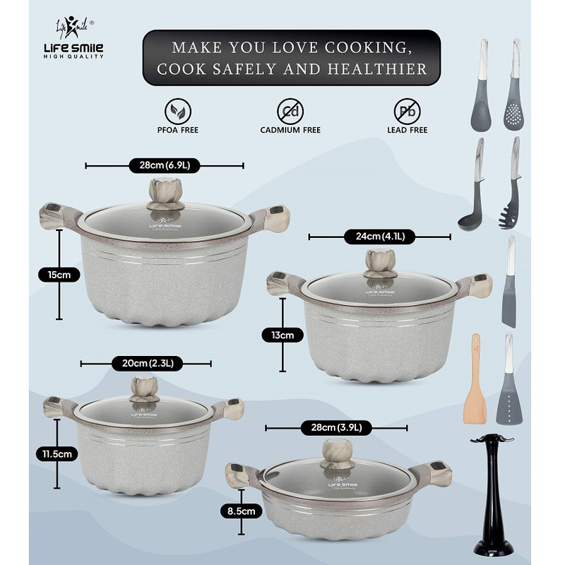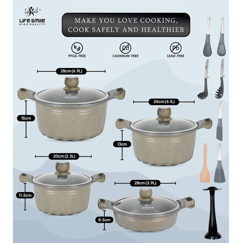 سایر توضیحاتسرویس پخت و پز نه پارچه لایف اسمایل شامل: قابلمه سایز 20 سانتی متر (2.3 لیتر)، قابلمه سایز 24 سانتی متر (4.1 لیتر)، قابلمه سایز 28 سانتی متر (6.9 لیتر)، ماهی تابه سایز 28 سانتی متر (3.9 لیتر) میباشد .و نایلون ملاقه سوپ و نایلون ترنر و قاشق سوراخ دار نایلونی و نایلون صافی قاشق و نایلون و ترنر و پایه نایلونی شکاف دار ،سطح داخلی قابلمه نچسب بادوام ساخته شده از پوشش نچسب گرانیت. تمیز کردن آن را آسان می کند و احتمال چسبیدن غذا به سطح را به حداقل می رساند. پوشش آن را بادوام تر می کند و دیگر لازم نیست نگران لکه شدن یا باقی مانده های دائمی باشید. سطح نچسب به شما امکان می دهد با حداقل مقدار کره/روغن/چربی بپزید و غذا را بسیار سالم تر می کند. پخت و پز با تهویه بخار: قابلمه ما با یک درب شیشه‌ای با ضخامت 5 میلی‌متر با طراحی تهویه بخار و با لبه فولاد ضد زنگ خالص کامل می‌شود. کاسرول را به راحتی با دسته دوبل بلند کنید. طراحی تهویه بخار برای امکان دقت و کارایی زمانی که شما به آن نیاز دارید تا متناسب با وظایف آشپزی شما باشد. پایین القایی سازگار: گرما را به سرعت و به طور یکنواخت هدایت می کند، گرما را طولانی تر نگه می دارد و باعث صرفه جویی در انرژی و زمان می شود که به آن اجازه می دهد به طور یکنواخت روی منبع گرما قرار گیرد. مناسب برای استفاده در اجاق گاز القایی، گازی، سرامیکی، برقی، هالوژنی و سوخت جامد. در اینجا یکی دیگر از مزایای آلومینیوم وجود دارد: به سرعت و به طور یکنواخت گرم می شود، بنابراین شما با "نقاط داغ" مواجه نمی شوید. بدنه آلومینیومی مستحکم دایکاست: توزیع سریع و یکنواخت گرما را تضمین می کند، کف با ضخامت 6 میلی متر توزیع پایدار گرما را در حین پخت و پز فراهم می کند، به سرعت گرم می شود، باعث صرفه جویی در زمان و انرژی می شود، ضخامت بدنه آلومینیومی با وزن مناسب و رسانای گرما می تواند اتلاف گرما یکنواخت را تضمین کند. و از ایجاد نقاط داغ جلوگیری می کند. این قابلمه برای ماندگاری، ایمنی و سلامت با در نظر گرفتن ایمنی برای خانواده شما ساخته شده است، این قابلمه با ساختار آلومینیومی با کیفیت خوب 100٪ بدون PFOA همراه با پوشش گرانیت سازگار با محیط زیست ساخته شده است، به این معنی که هیچ گونه مواد شیمیایی مضر در طول پخت و پز آزاد نمی شود. قابل استفاده در فر، مایکروویو، قابل شستشو در ماشین ظرفشویی، ضد خش و تمیز کردن آسان