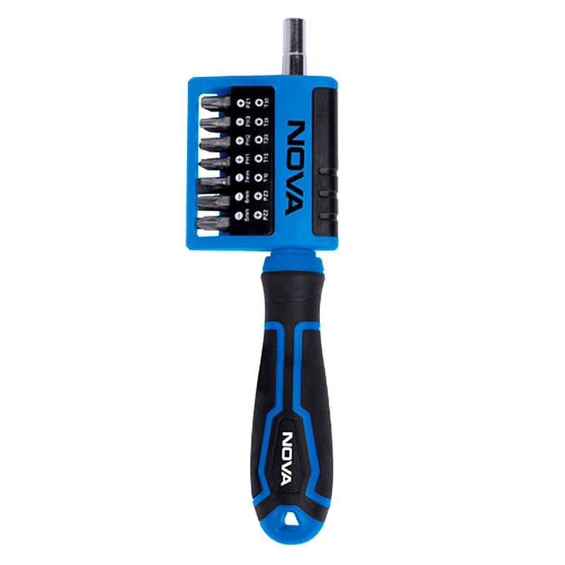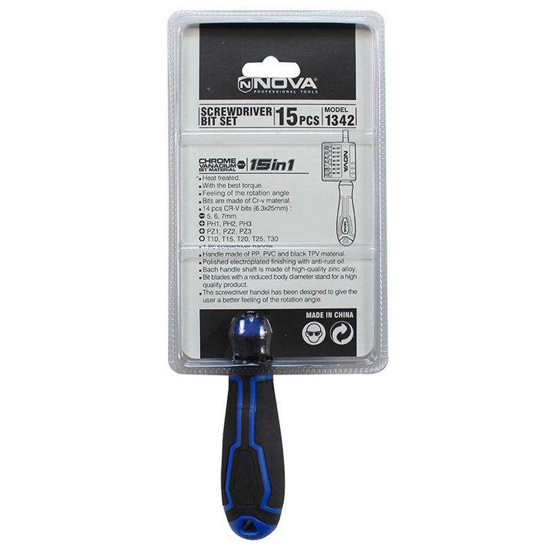 مجموعه 15 عددی سری پیچ گوشتی نووا مدل 1342 یکی از محصولات با کیفیت این برند است. دسته پیچ گوشتی با طراحی ارگونومیک از جنس ( PP - PVC - TPV ) ضد لغزش ساخته شده و میله آن از با کیفیت ترین متریال روی تولید شده است. کلیه سری های پیچ گوشتی از جنس کروم واندیوم می باشد و نوک آنها به صورت یک تکه پرداخت و ماشین کاری شده است. سری ها کاملا داخل دسته چفت می شوند و از مقاومت بالایی برخوردارند. این مجموعه دارای 3 عدد سری دوسو در سایز های ( 5 ، 6 ، 7 ) میلی متر - 3 عدد سری چهارسو در سایزهای ( PH1 ، PH2 ، PH3 ) - 3 عدد سری چهارسو خاردار در سایزهای ( PZ1 , PZ2 , PZ3 ) 5 عدد سری چهارسو در سایزهای ( T10 , T15 , T20 , T25 , T30 ) و یک عدد دسته به طول 22 سانتی متر است.