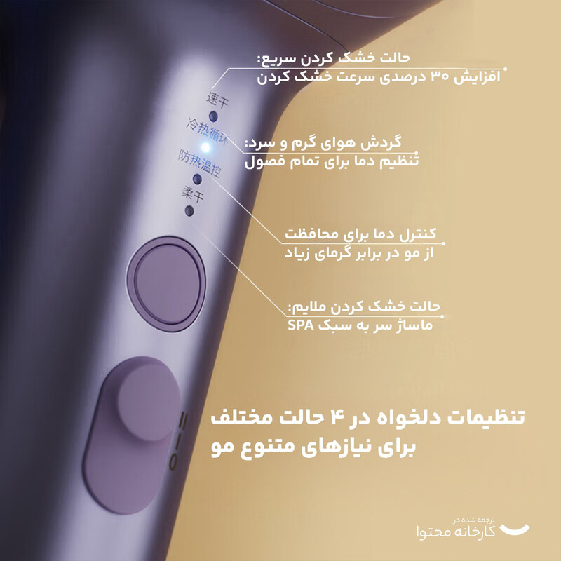 سایر مشخصاتدارای 2 عدد سنسور تشخیص دمای اتاق برای تنظیم اتوماتیک دمای سشوار - دارای فناوری یون آب و یون معدنی - تولید یون 1000 برابری نسبت به سشوار بدون یونزر - فناوری تولید یون معدنی مناسب برای حفاظت از مو در برابر اشعه ماورا بنفش - تولید 80 میلیون یون در هر بار استفاده تا مویی براق و بدون وز داشته باشید - با طراحی ارگونومیک 20 درصد سبکتر از مدل های معمولی - قابلیت تنظیم 4 حالت دما و 2 تنظیم سرعت - دارای نمایشگر LED - دارای دکمه Cool Shot ( قدرت چند برابری برای کار های حرفه ای ) - با بهبود جریان هوا ، بهبود فشار هوا ، بهبود انتقال حرارت و 22 درصد مصرف انرژی کمتر عملکرد بسیار بهتر و حرفه ای تری نسبت به سشوار های 2300 واتی دارد - دارای دیفیوزر مغناطیسی -