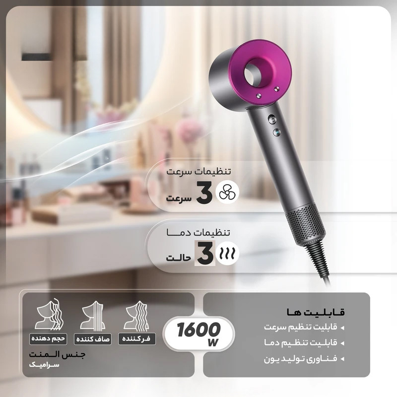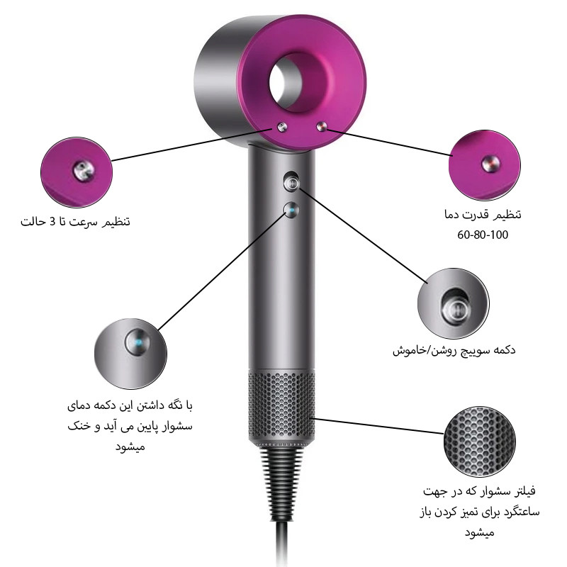 سایر مشخصات | این سشوار دارای سه تنظیم دقیق دما 100-80-60درجه و تنظیم باد سرد با نگه داشتن دکمه تعبیه شده روی دستگاه است |
