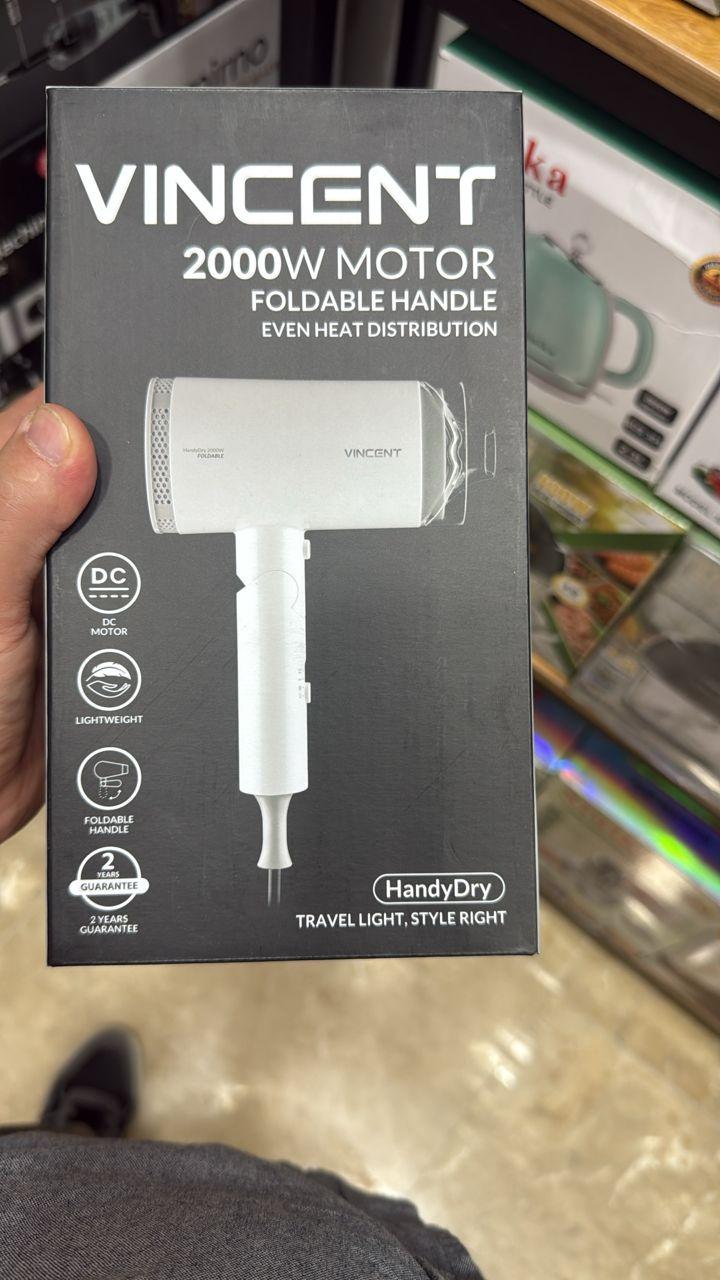 سشوار مسافرتی وینسنت HD3120 یک محصول فوق العاده برای خشک کردن و حالت دهی عالی مو به صورت همزمان و در کوتاهترین زمان ممکن می باشد که هم برای مصرف خانگی مناسب بوده و هم میتوان از آن در سفر استفاده نمود. این سشوار طراحی جمع و جوری دارد و هدف اصلی شرکت وینسنت ایجاد یک تجربه خوب برای تمام مشتریان خود می باشد. قیمت سشوار مسافرتی وینسنت HD3120 بسیار اقتصادی و مناسب است و کاربر می تواند هر جا که باشد، حالت دلخواه موهای خود را نیز داشته باشد. سشوار مسافرتی وینسنت مدل HD3120 بسیار سبک با طراحی مدرن بوده و از آنجایی که به دسته تاشو مجهز است، به راحتی و با کمترین میزان اشغال فضا در کیف، ساک و چمدان جای می گیرد. این سشوار برای انواع مو مورد استفاده قرار می گیرد و در سه درجه دما تنظیم می شود که بنا به نظر کاربر قابل انتخاب است. سشوار مسافرتی 3120 وینسنت دارای توان 2000 وات است که قدرت مناسبی بوده و برای یک سشوار مسافرتی کافی می باشد. معمولا سشوارهای مسافرتی قدرت موتور کمتری نسبت به سشوارهای خانگی دارند و معمولا نمیتوان برای حالت دادن حرفه ای موها از آن استفاده نمود. کابل برق این مدل 180 سانتی متر است و مانور حرکتی را به بهترین شکل برای کاربران ممکن می کند. سشوار مسافرتی وینسنت HD3120 به فناوری تولید یون مجهز است که یکی از امتیازات این دستگاه محسوب شده و از وز شدن موها بعد از خشک کردن و حالت دادن جلوگیری می کند. به این صورت که یون های تولید شده همراه باد توسط المنت سشوار خارج شده و با برخورد به موی سر، تمام الکتریسیته ساکن آن را از بین خواهد برد. سایر ویژگی های سشوار 3120 وینسنت به شرح زیر می باشد : یک عدد محدود کننده موتور DC متمرکز کننده پهن دکمه روشن / خاموش ساخت کشور چین