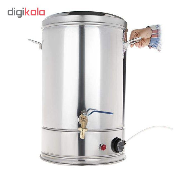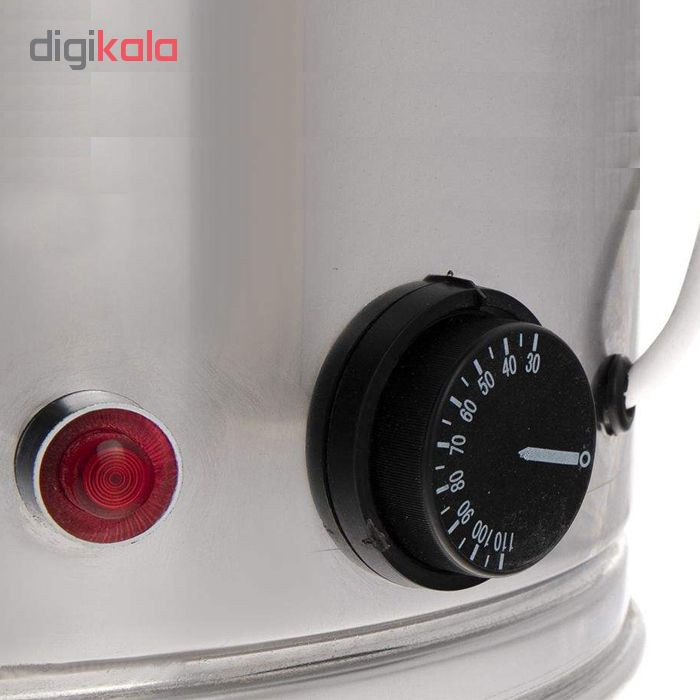 اگر قصد تهیه سماور برقی با گنجایش بالا دارید، یکی از گزینههایتان تهیه سماور برقی صنعتی است. این سماور دارای گنجایش 20 لیتری بوده و برای مراسمها بزرگ مذهبی، همایش ها و گردهمایی ها کارایی بالایی دارد. جنسی که برای این مدل در نظر گرفته شده استیل است. استفاده از این جنس باعث شده تا ماندگاری و طول عمر سماورتان افزایش یابد. بر روی این سماور دو دستگیره قرار دارد. با استفاده از این دستگیره جابهجایی سماور آسانتر میشود. یکی از ویژگیهای سماور برقی صنعتی سیم 150 سانتیمتری است. بر روی این سماور دکمه چرخشی جهت تنظیم دما قرار گرفته است. شما قادرید دمای سماور را از 30 تا 110 درجه تنظیم کنید و با رسیدن دمای مایع به درجه مورد نظر، دستگاه به طور اتوماتیک خاموش می شود و از آسیب رسیدن به سماور جلوگیری می کند. همچنین برای افزایش طول عمر سماور همواره از وجود آب داخل مخزن اطمینان حاصل کنید. همچنین این سماور برقی مجهز به سبد فیلتر چای بوده و امکان تهیه چای بدون تفاله را فراهم می کند. شیر دسته گازی نصب شده از کارایی و دوام بالایی برخوردار است. طراحی دوجداره این سماور به همراه عایق درون پشم شیشه، دارای دو مزیت حفظ دمای آب درون در مدت طولانی تر و جلوگیری از داغ شدن بدنه بیرونی سماور را فراهم میکند. بنابراین امکان سوختگی در هنگام دست زدن به بدنه سماور وجود نخواهد داشت. همچنین این عایق بندی میزان مصرف انرژی را به میزان قابل توجهی کاهش داده و دمای آب پس از گرم شدن برای چندین ساعت حفظ می شود. بنابراین میتوان مانند فلاسک از این سماور برقی نیز بهره گرفت و با یک تیر دو نشان را زد. این سماور با برخورداری از المنت 2000 واتی در مدت زمان کوتاهی آب را به نقطه جوش رسانده و خدمت رسانی تا 100 نفر را به خوبی را میسر میسازد.
