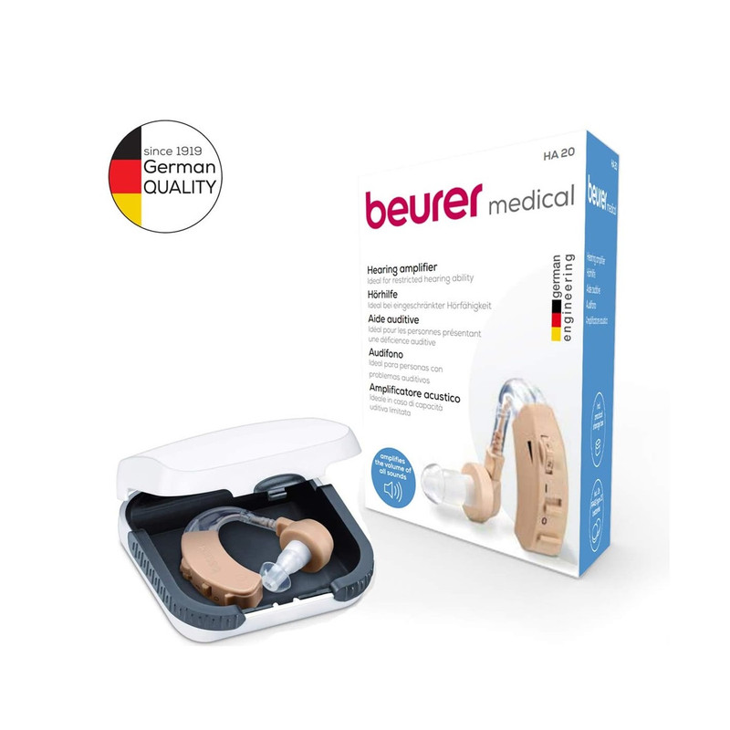 سایر توضیحاتسمعک Beurer HA 20 حجم صدا را در داخل و خارج از منزل تقویت می کند و بنابراین برای افراد دارای اختلالات شنوایی ایده آل است. به لطف تناسب ارگونومیک پشت گوش، استفاده از سمعک راحت است – با 3 ضمیمه، همچنین می توان آن را به صورت جداگانه با کانال شنوایی شما تنظیم کرد. ولوم را می توان به صورت بدون پله تنظیم کرد و تقویت حداکثر 40dB و رسیدن به حداکثر حجم حداکثر 128dB را تضمین می کند. شامل باتری و باتری یدکی و همچنین جعبه برای ذخیره سازی. حجم صداها را در داخل و خارج از خانه افزایش می دهد – ایده آل برای کسانی که دارای اختلالات شنوایی هستند تناسب ارگونومیک پشت گوش 3 پیوست برای سازگاری فردی با کانال شنوایی افزایش: حداکثر 40dB حداکثر حجم: حداکثر 128dB بهتر بشنوید: تقویت‌کننده شنوایی Beurer مخصوصاً برای افرادی که شنوایی ضعیف دارند مناسب است و همه صداها را در خارج از منزل یا داخل خانه تقویت می‌کند. محتاطانه: طراحی ارگونومیک به خوبی پشت گوش شما قرار می گیرد و همه کنترل ها به راحتی برای تنظیم در صورت نیاز قابل دسترسی هستند. راحت برای پوشیدن: شامل 3 ضمیمه برای کمک به تنظیم کانال گوش برای تناسب راحت. صدای بلند و واضح: HA20 دارای ولوم قابل تنظیم مداوم تا 128 دسی بل با حداکثر تقویت 40 دسی بل است. دستگاه پزشکی: تقویت کننده شنوایی Beurer یک دستگاه پزشکی تایید شده است و در یک جعبه ذخیره سازی مفید محافظت می شود.