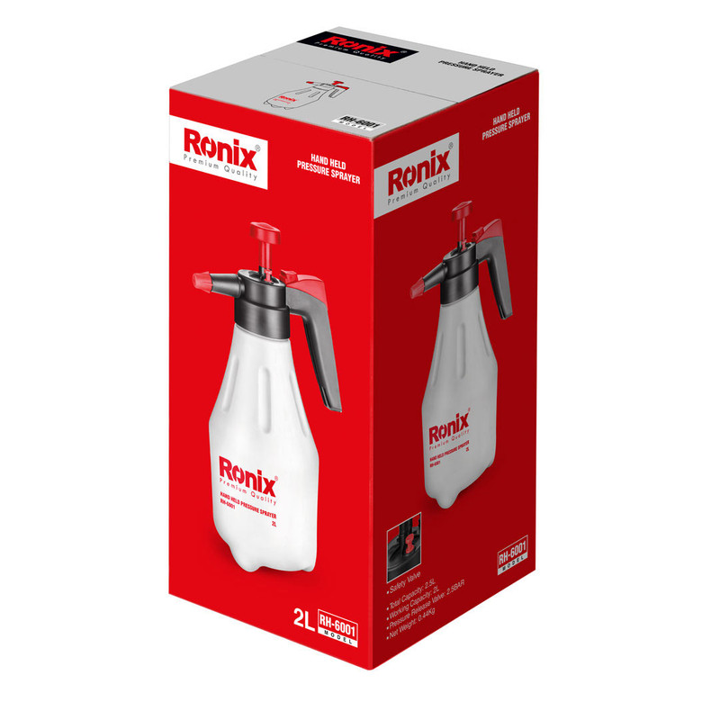 مدل محصول RH-6001 برند رونیکس یک سمپاش میباشد ، که دارای نازل قابل تنظیم به صورت مستقیم و پاشش پودری و دارای شیر اطمینان برای محافظت از سم پاش و کاربر و همچنین بدنه از جنس پلی اتیلن با کیفیت با حجم 2 لیتر میباشد.