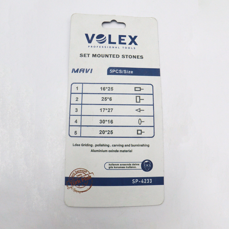 سایر توضیحات | - سنگ انگشتی ولکس ممجموعه 5 عددی - دارای 5 عدد فرز انگشتی در سایز های مختلف - شامل 5 سری فرز انگشتی در سایزهای استوانه 25 × 16 ، استوانه سر تخت 6 × 25 ، استوانه 25×20 ، مخروطی 20 × 30 و استوانه 16 × 30 میلیمتر مناسب برای مصارف خانگی و کارگاهی - کیفیت بالا - استفاده برای سنگ زنی و ساب زدن جای جوش و سنگ زنی آهن و قطعات فولادی استفاده برای براده برداری و شکل دهی به مواد متریال های مختلف سایز کولت سنگ انگشتی ها ۶ میلیمتر می باشد |
