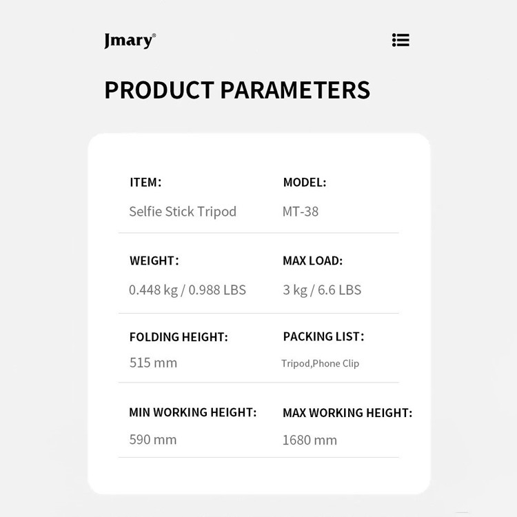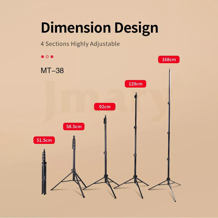 سهپایهی جی ماری مدل MT-38 وسیلهای جانبی مناسب، برای عکاسان تازهکار و باتجربه محسوب میشود. بهجرئت میتوان گفت استفاده از سهپایه یکی از ضروریترین کارهای یک عکاس است. این مدل برای عکاسی با انواع دوربینهای مختلف،گوشی،پروژکتور،میکروفن بسیار مناسب است. محور میانی سهپایه مخصوص عکاسی دارای گیره جهت نگهداری دستگاه های قابل استفاده شماست که به شرطی که توان پیچ شدن به پایه را داشته باشند در غیر این صورت شرکت جی ماری یک نگهدارنده گوشی موبایل به این سه پایه اضافه کرده است که در دو حالت افقی و عمودی قابل استفاده است ..سری این سه پایه قابلیت چرخش 180 درجه دارد به طوری که شما می توانید در صورت نیاز در محور زاویه 180 درجه حالت صفحه نمایش را تغییر دهید. گردنی سه پایه جی ماری قابلیت تغییر ارتفاع دارد. پایه جی ماری در حالت معمولی 58.5 سانتی متر و در حالت باز تا 168 سانتی متر می باشد.