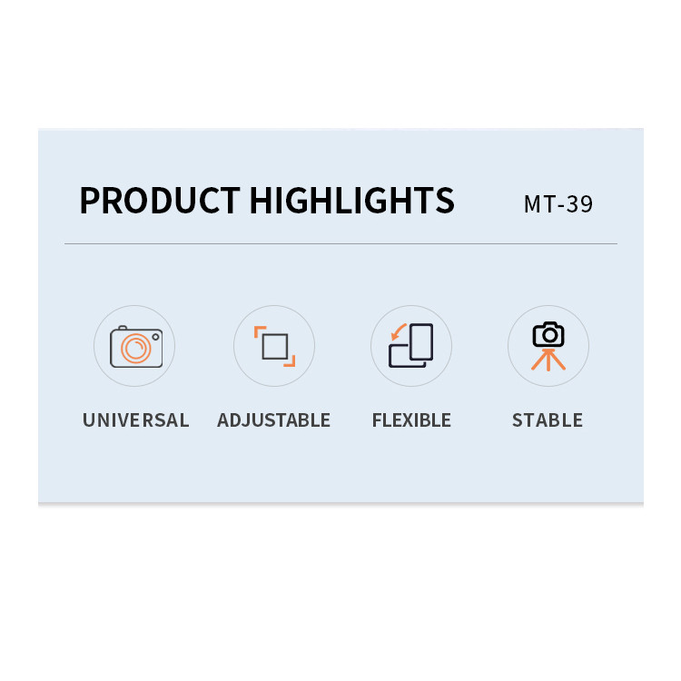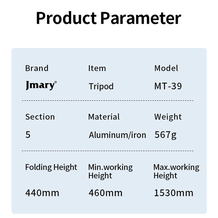 سه‌پایه‌‌ی جی ماری مدل «MT-39» وسیله‌ای جانبی مناسب، برای عکاسان تازه‌کار و باتجربه محسوب می‌شود. به‌جرئت می‌توان گفت استفاده از سه‌‌پایه یکی از ضروری‌ترین کارهای یک عکاس است. این مدل برای عکاسی با انواع دوربین‌های مختلف،گوشی،پروژکتور،میکروفن بسیار مناسب است. محور میانی سه‌پایه مخصوص عکاسی دارای گیره جهت نگهداری دستگاه های قابل استفاده شماست که به شرطی که توان پیچ شدن به پایه را داشته باشند در غیر این صورت شرکت جی ماری یک نگهدارنده گوشی موبایل به این سه پایه اضافه کرده است که در دو حالت افقی و عمودی قابل استفاده است و قابلیت تغییر سایز از 3.5 تا 6/8 اینچ را دارد.سری این سه پایه قابلیت چرخش 180 درجه دارد به طوری که شما می توانید در صورت نیاز در محور زاویه 180 درجه حالت صفحه نمایش را تغییر دهید. گردنی سه پایه جی ماری قابلیت تغییر ارتفاع دارد. پایه جی ماری در حالت معمولی 55.5 سانتی متر و در حالت باز تا 162 سانتی متر می باشد.