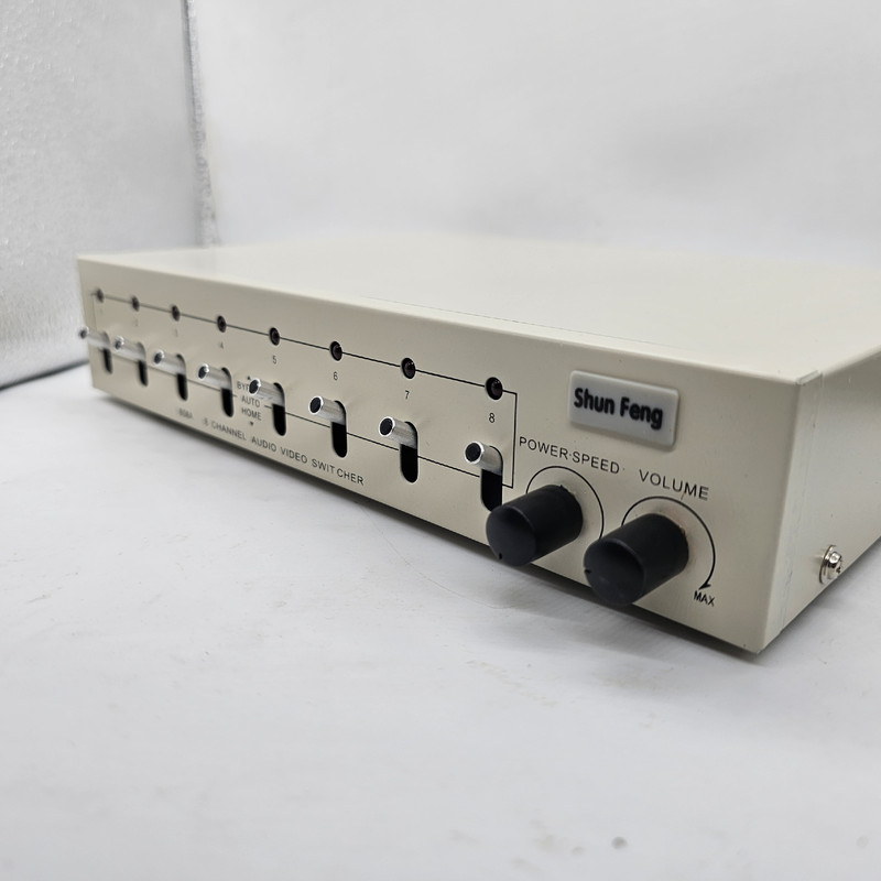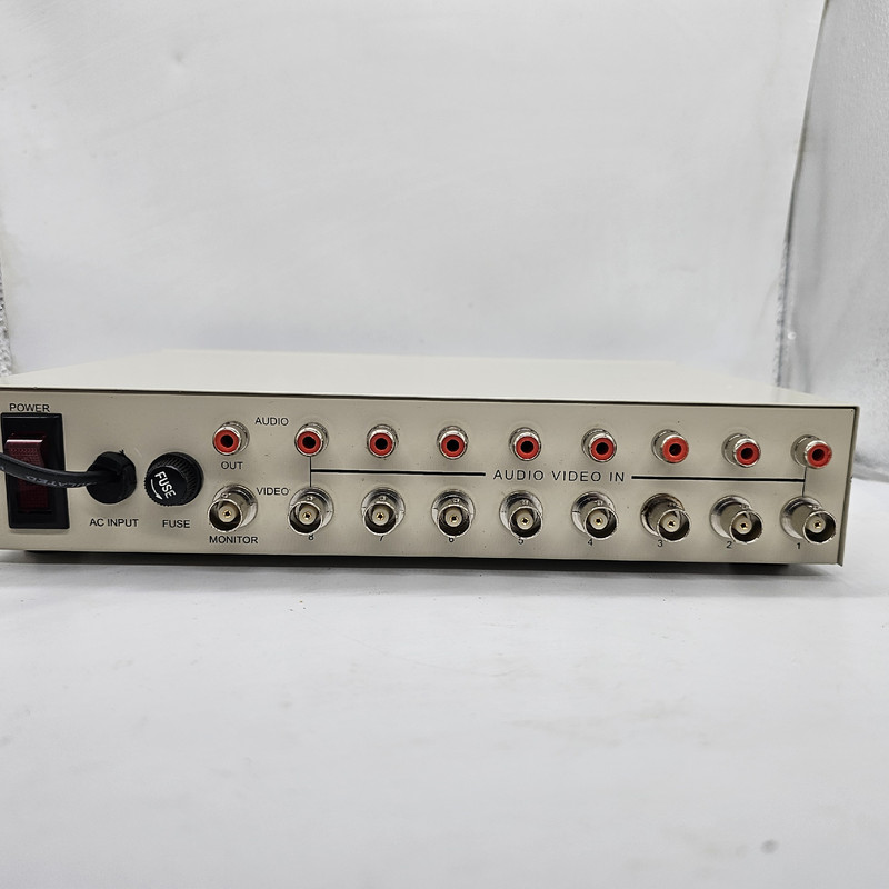 سوییچ 1 به 8 تصویر و صدای av . می توانید 8 تصویر ورودی به این دستگاه بدهید و 1 خروجی av داشته و همچنین ۸ ورودی صدا به این دستگاه بدهید و ۱ خروجی صدا داشته باشید دقت کنید این سوییچ 8 تصویر را بصورت تک تک نمایش میدهد نه به صورت 8 تصویر همزمان و دارای قابلیت عوض کردن اتوماتیک 8 تصویر که شما میتوانید آنرا با پتاسیومتری که روی دستگاه قرار دارد مدت زمان تعویض را تعویض کنید دارای قابلیت کم و زیاد کردن صدا منبع تغذیه برق ۲۲۰ ولت مستقیم