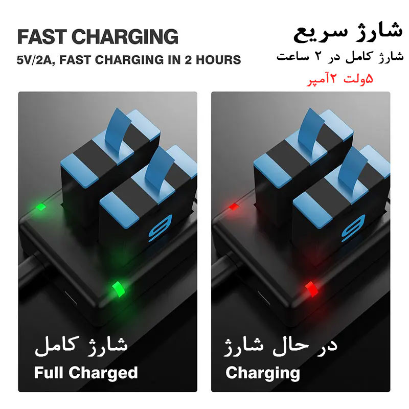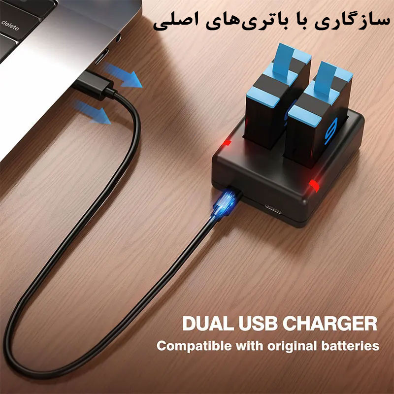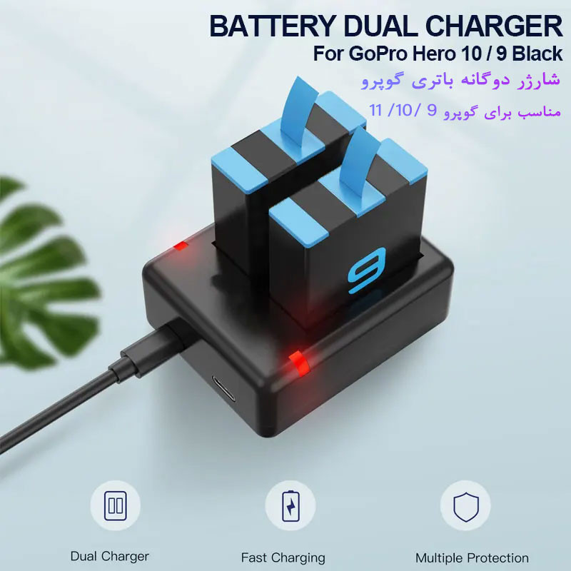 شارژر دوبل باتری گوپرو مناسب برای قرار دادن دو عدد باتری گوپرو مدلهای Gopro Hero 9 / Gopro Hero 10 و Gopro Hero 11 است . مزیت این شارژر نسبت به مدلهای مشابه بازار امکان فست شارژینگ است. بر روی این شارژر یک عدد پورت Type C و یک عدد پورت Micro برای شارژ باتری ها وجود دارد. به همراه شارژر یک عدد کابل تایپ سی نیز ارائه می گردد. بر روی شارژر دو عدد چراغ نمایشگر نیز وجود دارد، هنگامی که رنگ آن قرمز باشد به این معنی است که باتری ها در حال شارژ هستند و هنگامی که رنگ آن سبز شود به این معنی است که باتری ها به صورت کامل شارژ شده اند.