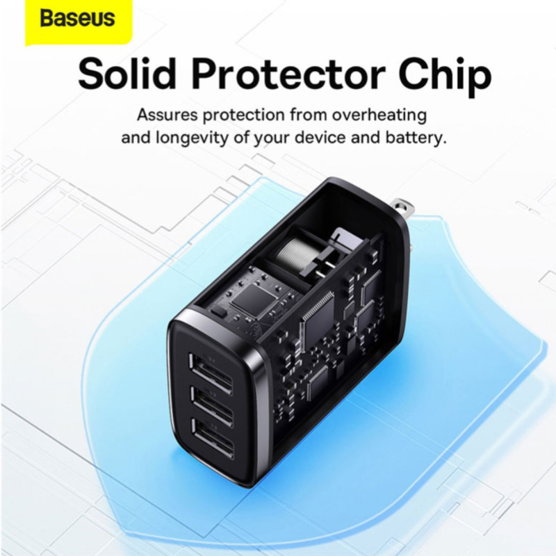 شارژر دیواری بیسوس CCXJ020001 از پلاستیک مقاوم PC ساخته شده و دارای ابعاد 40*28*45.7 میلی متر و وزن حدودی آن 52.8 گرم می باشد. ابعاد و وزن این محصول باعث شده که شما بتوانید آن را به هرجای به راحتی منتقل کرده و از آن استفاده کنید. آداپتور بیسوس Baseus CCXJ020001 دارای سه درگاه USB می باشد که شما می توانید به صورت تکی و یا همزمان از این درگاه ها استفاده کنید.