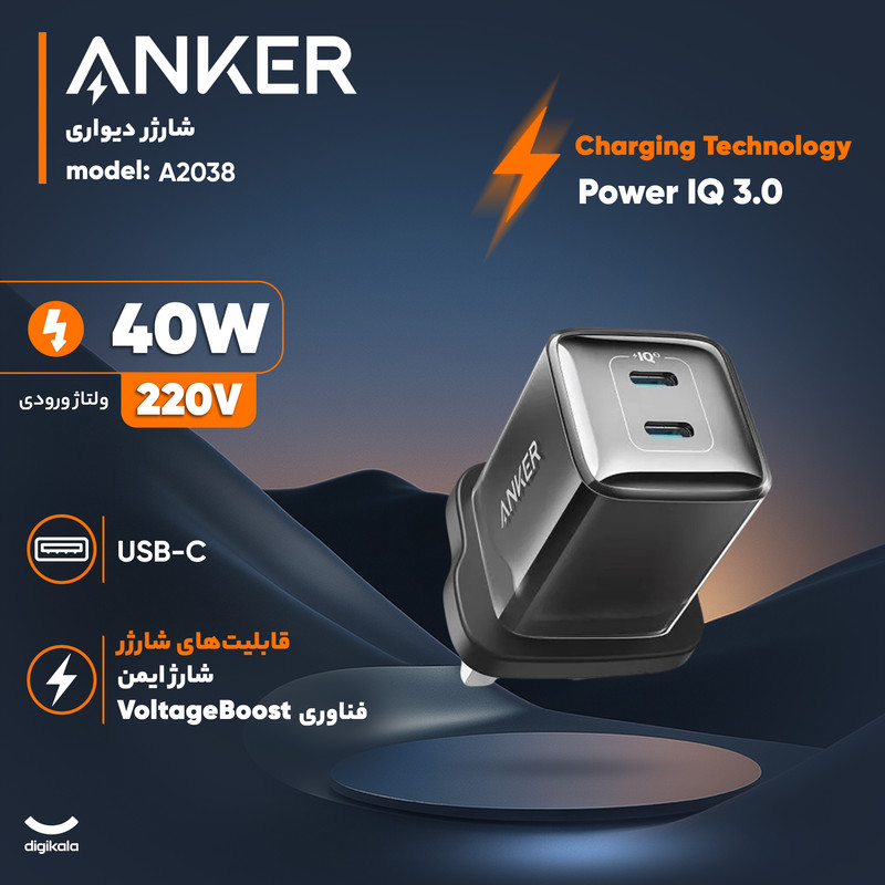 شارژر دیواری ۴۰ وات انکر مدل A2038 یک شارژر پیشرفته و مطمئن برای گوشی‌های هوشمند، تبلت‌ها و لپ‌تاپ‌های کوچک است که با طراحی جمع‌وجور و امکانات هوشمند، تجربه شارژ سریع و ایمن را برای کاربران فراهم می‌کند. این شارژر با وزن ۸۵ گرم و بدنه‌ای از جنس پلاستیک مقاوم ساخته شده و اتصال آن به برق از طریق سه‌پین استاندارد انجام می‌شود، که استفاده راحت در خانه، محل کار و سفر را ممکن می‌سازد.