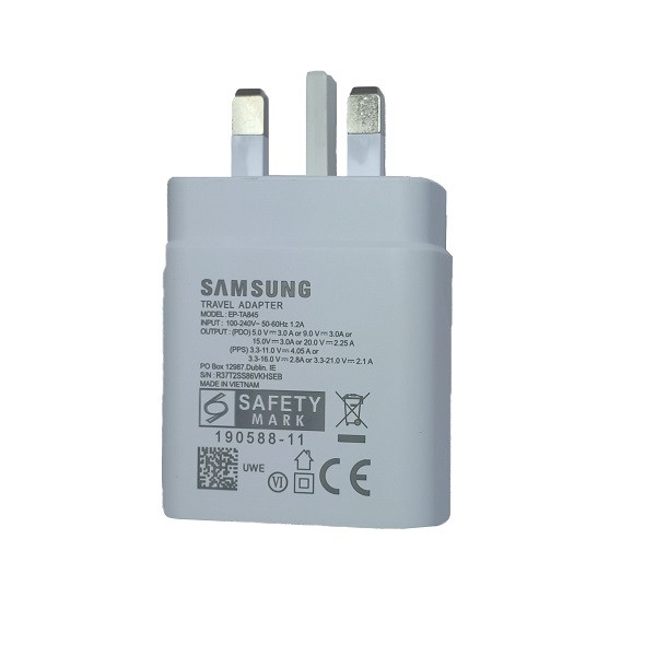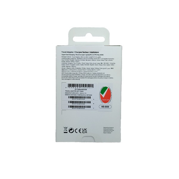 شارژر دیواری 2023 45W EP-TA845 به همراه کابل دو سر Type-C می باشد. این آداپتور دارای فناوری PD 3.0 است که با استفاده از آن می توانید دستگاه خود را با سرعت بیشتر و با توان 45 وات شارژ کنید. شدت جریان خروجی این شارژر 5 آمپر می باشد که می توان از آن برای شارژ کردن تبلت هم استفاده کنید. برای این شارژر از چیپ هوشمندی استفاده شده تا با اتصال دستگاه به صورت خودکار جریان مناسب را برای دستگاه تامین کند. درگاه خروجی این محصول هم از نوع USB-C است. البته در کنار این شارژر یک کابل تبدیل USB-C به USB-C به طول یک متر هم ارائه میشود. شارژر EP-TA845 سایر محصولات و موبایل های سری 2019 به بالا و گوشی هایی که توانایی شارژ سوپرفست را دارند پشتیبانی می کند.درگاه خروجی این محصول هم از نوع USB-C است.