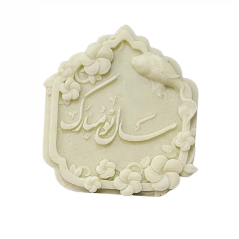شمع کتیبه سال نو مبارک با طراحی زیبا. برجسته است،اطرافش با نقش هایی از گل ها و یک ماهی نزئین شده است.و میتوانید به عنوان یک دکوری زیبا بر سر سفره هفت سین قرار دهید.
