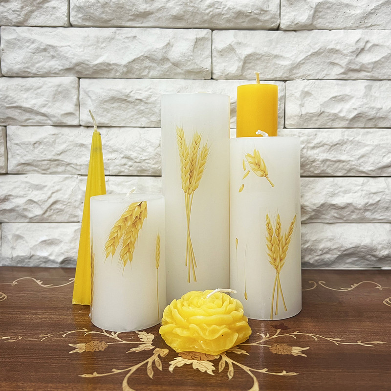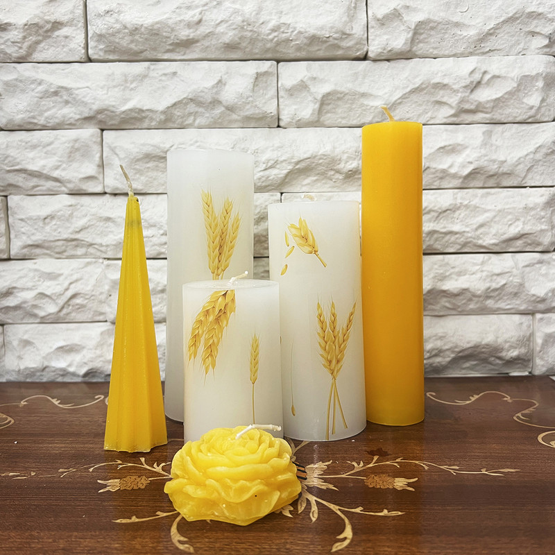 سایر توضیحات قطر سه شمع استوانه: 6 سانتی متر و قطر شمع استوانه خردلی 4 دارای چهار ارتفاع 15، 10و18 و 20 سانتی متر شمع هرمی قطر 4 ارتفاع 14 1 عدد گل ارتفاع 4 قطر 7 پارافین کریستال بدون بو وبدون دود فیتیله پارافین شده