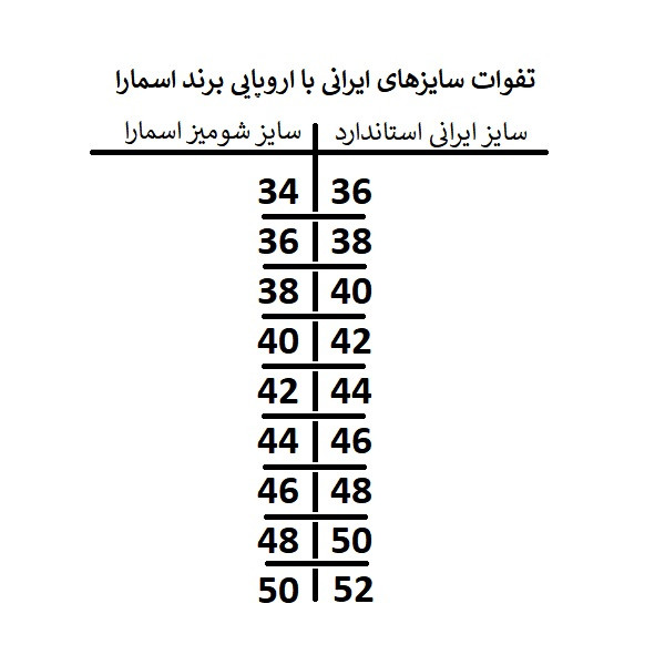 استاندارد سایز البسه اروپایی با ایرانی متفاوت میباشد و باید یک سایز کوچکتر انتخاب شود. یعنی در صورتی که سایز ایرانی شما 40 است، سایز شومیز اسمارای 38 بیشتر مناسب شماست.