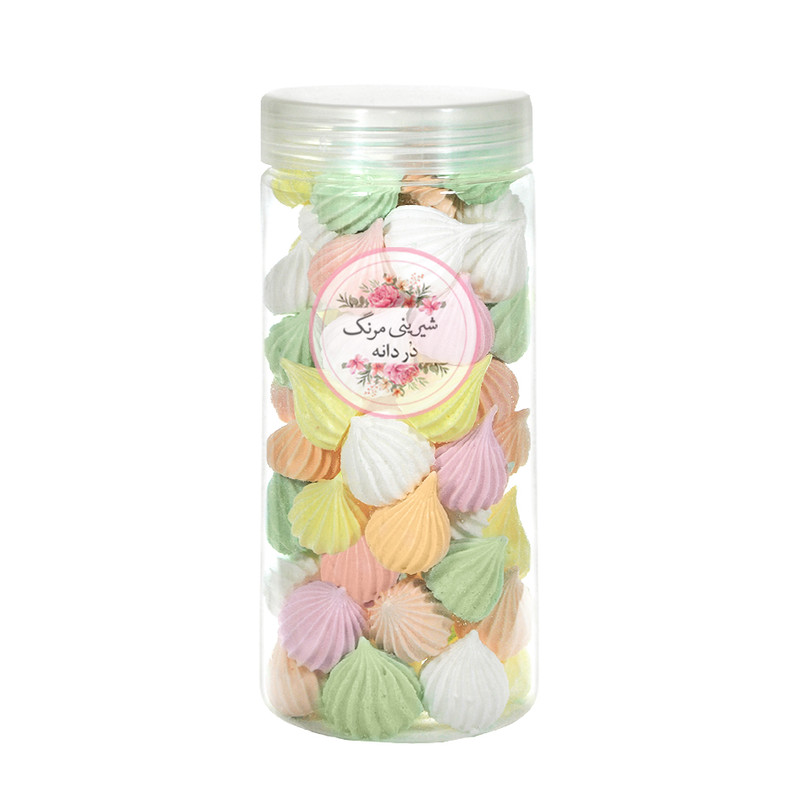 شیرینی های مرنگ در دانه با طعمهای طالبی . نارگیل . توت فرنگی . پرتقال و موز ترد و خوشمزه آماده مصرف برای همه افراد مخصوصا کودکان و همچنین برای جایگزینی قند و غیره کنار چای یا شیر فوق العاده است. همچنین برای ماندگاری بالا باید در جای خشک مثل محیط منزل در ظرف درب دار نگهداری شود.