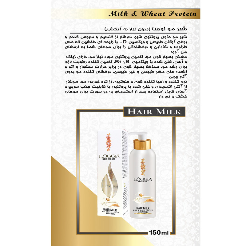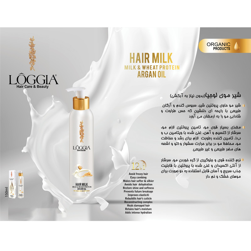 شیر موی لوجیا (بدون نیاز به آبکشی) حاوی پروتئین شیر ، سبوس گندم و آرگان طبیعی با رایحه ای دلنشین که حس طراوت و شادابی مو را به ارمغان می آورد همچنین مغذی بسیار قوی مو، تامین پروتئین لازم مو ، سرشار از کلسیم و آهن ؛غنی شده با ویتامین ب و ب۱، تامین کننده رطوبت لازم برای رشد و حفاظت مو ، محافظ مو در برابر حرارت سشوار و اتو و اشعه های مضر طبیعی و غیر طبیعی و نرم کننده قوی و جلو گیری از گره خوردن مو ، سرشار از آنتی اکسیدان و غنی شده با پروتئین با قابلیت جذب سریع و آسان قابل استفاده به دو صورت برای موهای خشک و نم دار نیز میباشد.