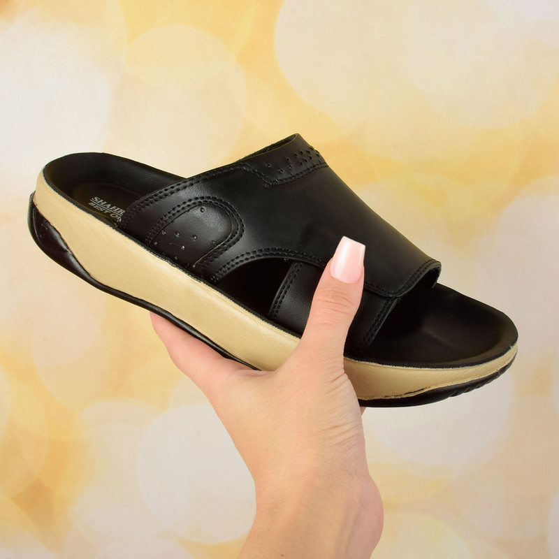 صندل طبی مردانه شهرام طب با طراحی باز در قسمت جلو و انتها، از تعریق پا و ایجاد زخم بین انگشتان جلوگیری می‌کند و راحتی و سلامت پاها را تضمین می‌کند.