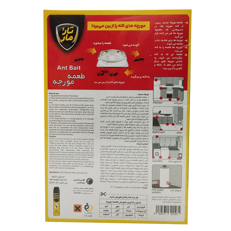 طعمه مورچه تارومار بیرون از لانه مورچه ها، در مسیر هایی که معمولا مورچه ها طی میکنند قرار میگیرد. مورچه ها برای تعذیه، جذب طمعه میشوند. مورچه های طعمه را به لانه میبرند. طعمه ای که به لانه بازگردانده میشود، به کشتن مورچه های درگر ادامه میدهد تا ملکه و کلونی را از بین ببرد.