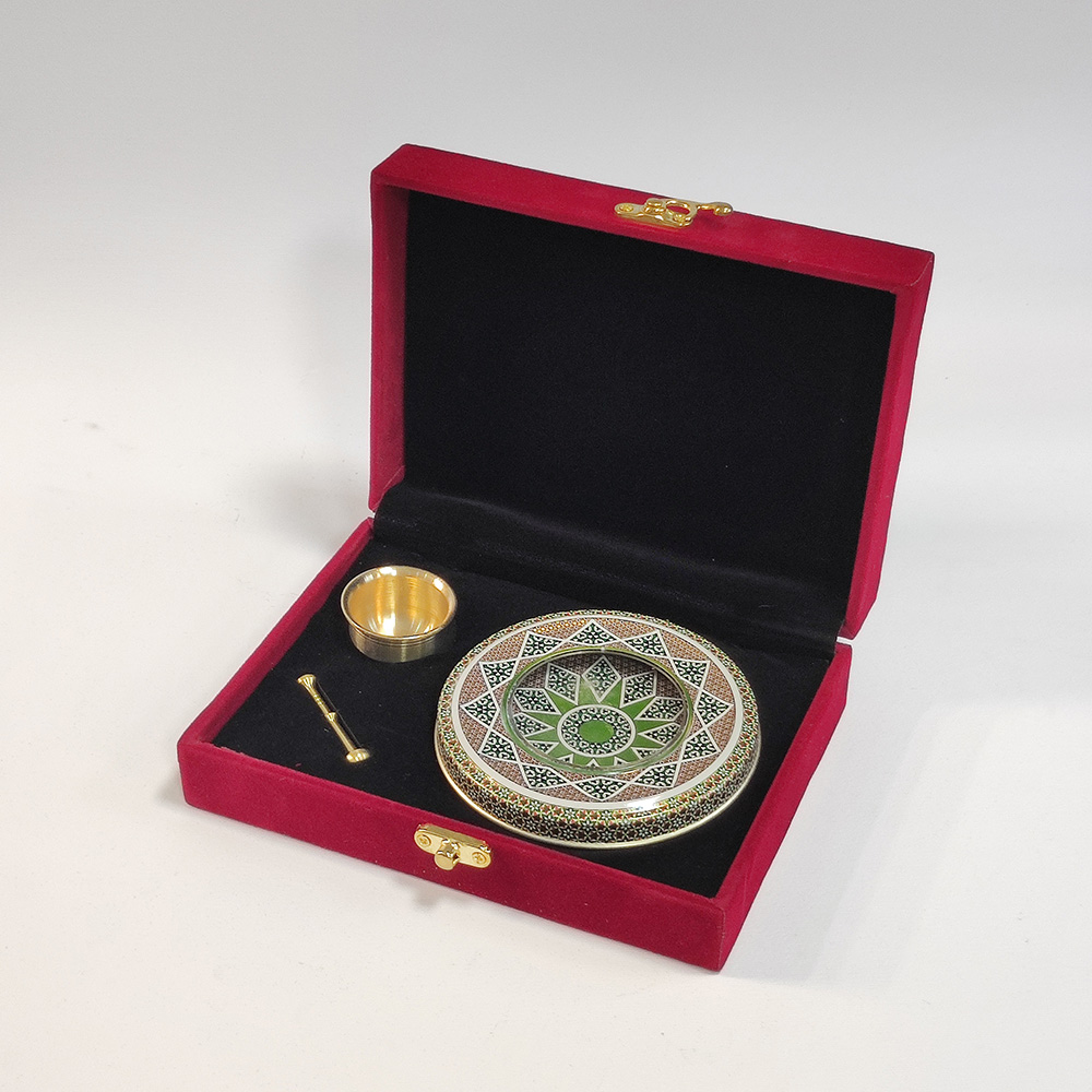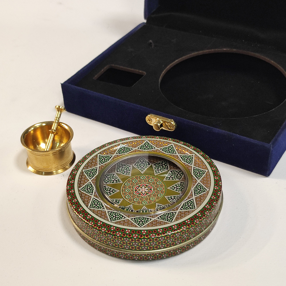 اجزای داخلی این محصول یک ظرف خاتم ۵ گرم (خالی) و یک هاون کادویی هست که داخل آنرا میتوان با زعفران و هل یا گل محمدی پر کرد.