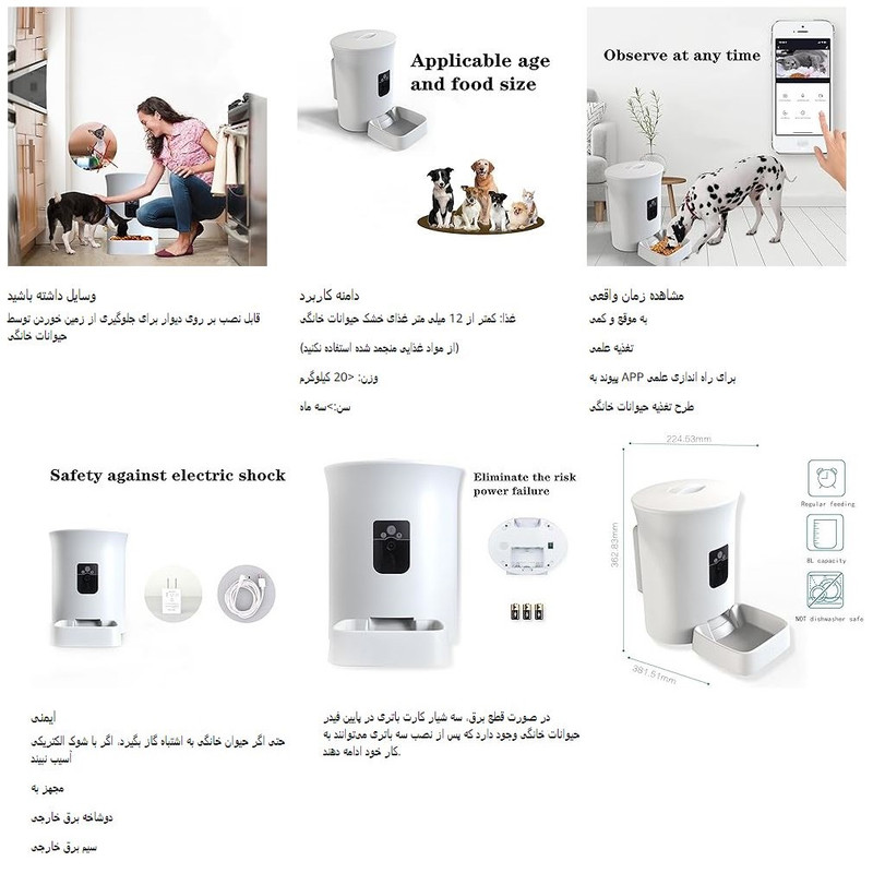 سایر توضیحاتظرف غذا هوشمند سگ و گربه با یک نرم افزار از راه دور برای کنترل و تغذیه حیوانات خانگی در هر زمان و هر مکان استفاده می کنید و این امکان را به شما می دهد که از خارج خانه این امر را . وقتی بیرون می‌روید، می‌توانید زمان تغذیه را از طریق برنامه تنظیم کنید و به‌طور خودکار غذای مورد نیاز حیوان خانگی خود را آزاد کنید.ویژگی خاص ضبط صدا،قابل نصب بر روی دیوار برای جلوگیری از زمین خوردن توسط حیوانات خانگی، در صورت قطع برق، سه شیار کارت باتری در پایین فیدر حیوانات خانگی وجود دارد که پس از نصب سه باتری می‌توانند به کار خود ادامه دهند. دوربین داخلی با کیفیت بالا، میکروفون و عملکردهای ضبط. وقتی بیرون می روید، می توانید مشاهده کنید که آیا حیوان خانگی شما به طور منظم از طریق برنامه غذا می خورد یا خیر. شما همچنین می توانید با حیوان خانگی خود ارتباط برقرار کنید. توزیع غذا: حداکثر 20 وعده غذا پشتیبانی می شود، 10-12 گرم در هر وعده. به طور منظم به آنها غذا دهید تا به شما کمک کند وزن آنها را کنترل کنید و آنها را با خود به عادات سالم تبدیل کنید. فضای زیاد، سطل تغذیه با ظرفیت 8 لیتر، حدود 4.0 کیلوگرم غذای حیوانات خانگی را ذخیره می کند. نکات عملیاتی: فقط برای غذای خشک، قطر غذای خشک کمتر از 12 میلی متر غذای حیوانات خانگی قابل استفاده است.