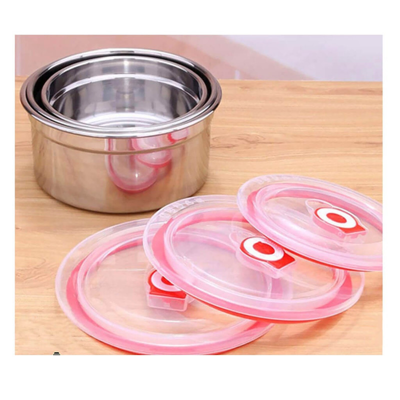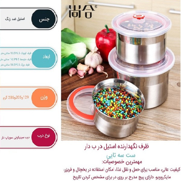 در هر آشپزخانه ای نیاز به استفاده از ظروف نگهدارنده غذا که به صورت درب دار می باشند ضروری می باشد، بسیاری از مواقع نیاز به نگهداری مواد غذایی پخته شده در یخچال یا فریزر هستیم و اگر این مواد در ظرف بدون درب و نا منساب نگهداری شود علاوه بر امکان آلودگی مواد غذایی ممکن است کیفیت آنها پایین بیاد مثلا با قرار گرفتن در کنار سایر مواد غذایی بو بگیرد یا حتی یخچال از آن مواد بو بگیرد. ظرف نگهدارنده استیل سه تکه، محصولب با کیفیت و کارایی بالا که به شما کمک می کند تا با مشکلات گفته شده روبرو نشوید.این ست دارای طراحی بسیار زیبایی می باشد و سه عدد کاسه استیل در سایز های مختلف دارد که هر کدام یک درب سوپاپ دار دارد. سوپاپ تعبیه شده بر روی درب برای خارج کردن بخار و یا ورد هوا به داهل ظرف می باشد. . این ظروف با بدنه استیل با کیفیت و ضخامت مناسب و دارا بودن درب پلاستیکی به خوبی از غذا و مواد خوراکی محافظت می نمایند. شما می توانید این ظروف را در داخل یخچال، فریزر یا حتی برای گرم کردن غذا مورد استفاده قرار دهید.یکی از مهمترین مزیت های این ظروف دارا بودن سه کاسه در سه سایز متفاوت می باشد که به شما این امکان را می هد در هر موقعیتی متناسب با حجم مورد نظر یکی از آنها را مورد استفاده قرار دهید. کاسه کوچک این ست دارای ارتفاع 6.5 و قطر 13.5،ظرف متوسط ارتفاع 8.5 و قطر 16.5، ظرف بزرگ ارتفاع 9.5 و قطر 18.5 سانتی متر داشته و گنجایش هر ظرف به ترتیب ذکر شده عبارت است از ظرف کوچک 600 میلی لیتر، متوسط 1100 میلی لیتر و ظرف بزرگ 1800 میلی لیتر.این ظروف را می توانید علاوه بر شستشو با دست در داخل ماشین ظرفشویی نیز قرار دهید. این ست سه تایی ظروف نگهدارنده غذای استیل می تواند برای حمل غذا، گرم کردن غذا یا حتی نگهداری غذا در یخچال و فریزر مورد استفاده قرار گیرد.