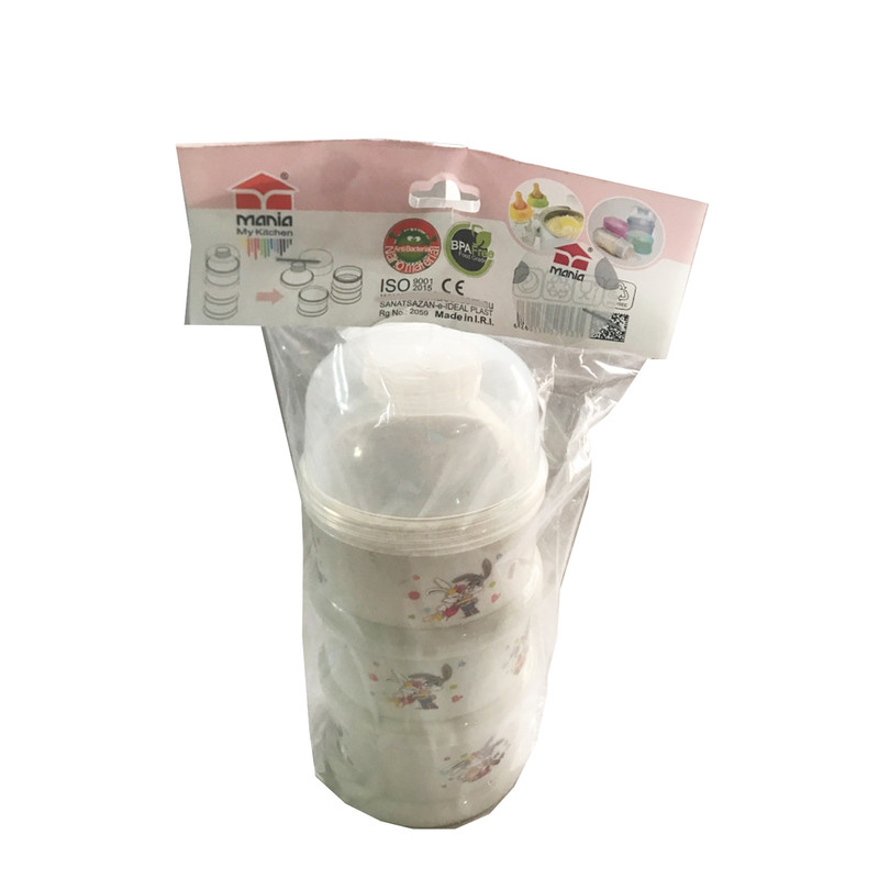 این محصول شامل سه ظرف کوچک و دو در (یکی مخروطی شکل مختص ریختن پودر شیر خشک و دیگری در ظرف)می باشد که بصورت در تکی و یا باهم قابل استفاده است. می توان از این محصول جهت نگهداری و حمل انواع مواد غذایی کودک از قبیل تنقلات،میوه های خرد شده پودر شیر کودک و غذا های مایع نظیر سوپ و...استفاده نمود. این محصول فاقد ماده مضر بی پی ای ( Free BPA ) میباشد و برای بدن ضرر ندارد.