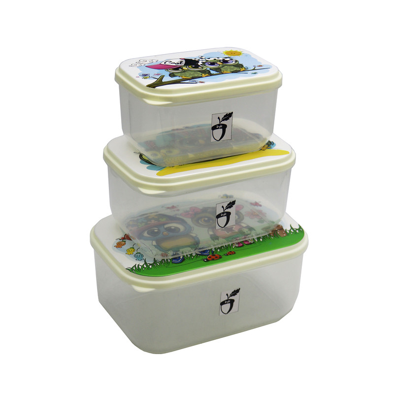 سایر توضیحات | - مجموعه 3 عددی ظرف غذا مدل بلوط - طرح : جغد خانواده - طرح قالب : مستطیلی - طرح جالب کارتونی نگهدارنده میوه و غذا - در 3 سایز سایز بزرگ : 22.5x16x11سانتیمتر . متوسط : 19x14x9.5 سانتیمتر . کوچک : 16x11x8.5 سانتیمتر - جنس : پلاستیک فشرده ساخته شده از بهترین مواد درجه یک موجود در بازار - وزن : 380 گرم |