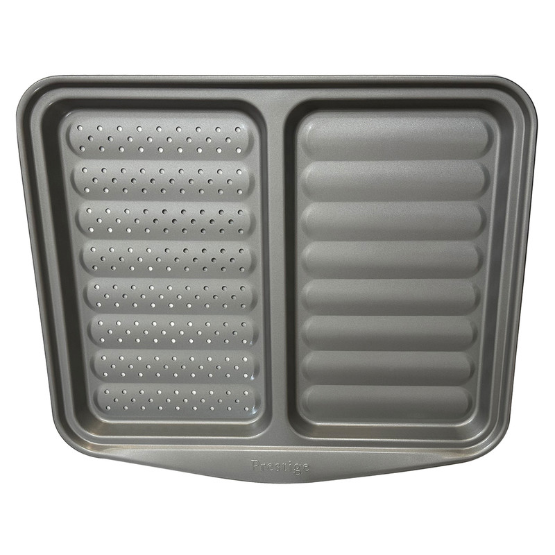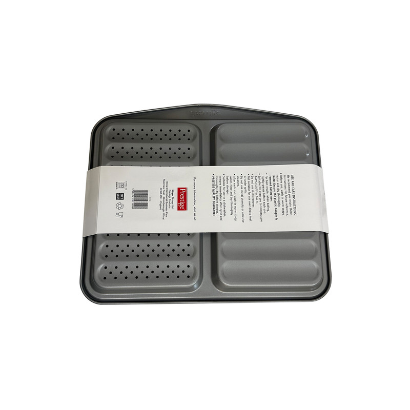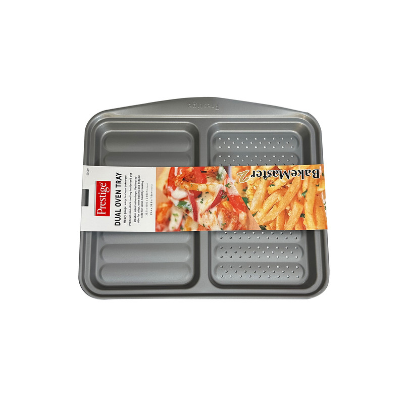 سینی دو طرفه و دو منظوره پخت و پز برند پرستیژ (Prestige) یک برند انگلستانی بوده که تحت لیسانس و توسط چین تولید می شود. این سینی دو طرفه مناسب پخت انواع سیب زمینی، پیتزا و... مورد استفاده قرار گرفته و از 2 لایه تفلون بسیار مقاوم و نچسب ساخته شده است. ابعاد این سینی دو طرفه 41x36x3 سانتی متر می باشد.