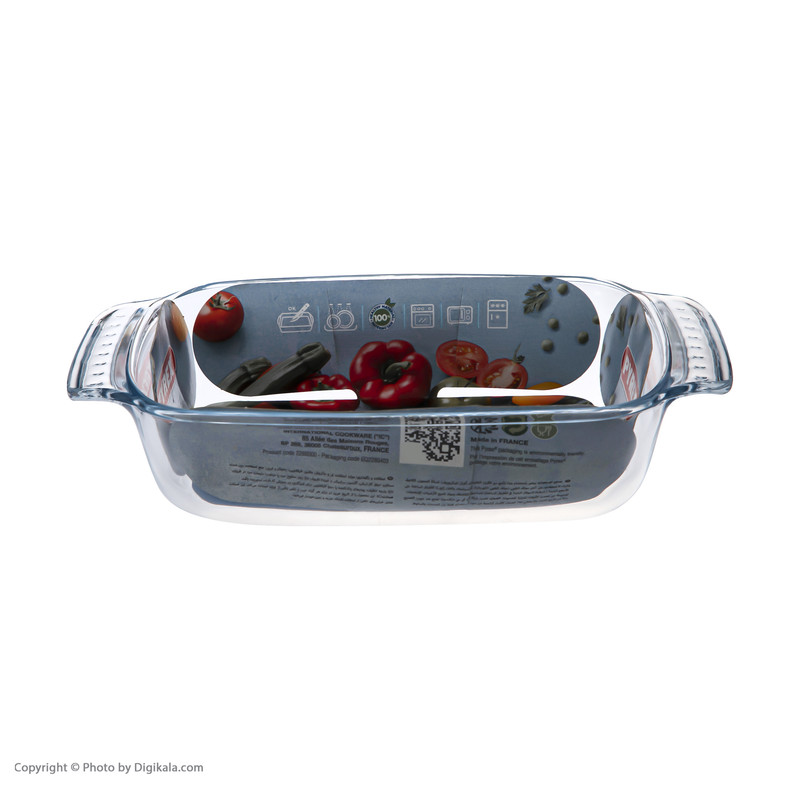 مزیت ظروف پخت پیرکس نسبت به انواعی که بدنهای از جنس فلز دارند، در این است که با خیالی آسوده میتوانید آنها را داخل مایکروفر قرار دهید. برای پخت انواع غذاهای گرم و دسرهای سرد قادر هستید از این ظروف داخل اجاق فر، مایکروفر و فریزر استفاده کنید. تنها نکتهی قابلتوجه در رابطه با ظروف پیرکس جلوگیری از شوک حرارتی است که موجب شکستن آنها میشود. ظرف پخت پیرکس کد 001 از پیرکس ساخته شده و برای پخت غذا، کیک و دسر مورد استفاده قرار میگیرد. این ظرف را با خیالی آسوده بعد از استفاده میتوان داخل ماشین ظرفشویی شست. نگهداری از این ظروف اهمیت بسیاری دارد. زمانی که ظرف داغ روی اجاق قرار دارد، به آن آب سرد اضافه نکنید. بلافاصله بعد از خروج از فریزر ظرف را روی اجاق یا داخل مایکروفر داغ قرار ندهید؛ زیرا این موارد موجب شوک حرارتی و شکستن ظرف میشوند. ابعاد کلی این محصول برابر با 5 × 13 × 22 سانتیمتر و وزن آن 470 گرم است.