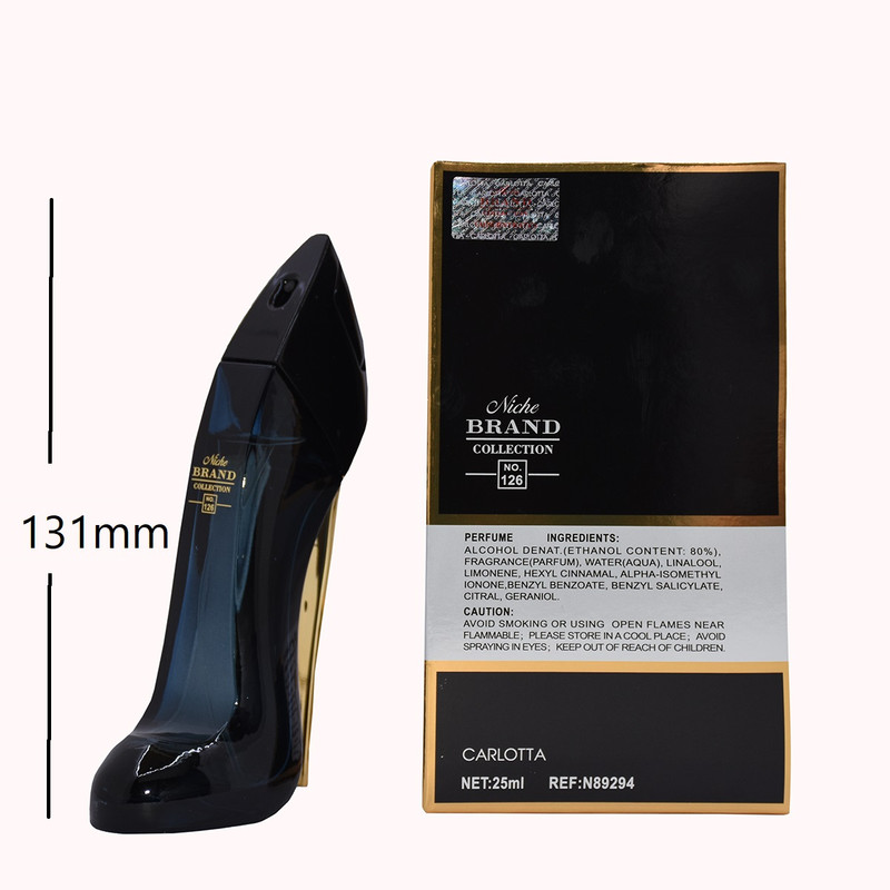 بطری به شکل یک کفش مجلسی زنانه طراحی شده است. بدون شک این طرح برای هیچ عطر دیگری استفاده نشده است. پاشنهی این کفش به رنگ طلایی است و درخشش خوبی در نور دارد. این کفش شیشهای بهراحتی در دست بانوان جا میشود. برای اسپریکردن این عطر کافی است قسمت بالایی بطری را فشار دهید. در این لحظه بوی بادام و قهوه در فضای اطراف پخش میشود. این ترکیب انرژی و هیجان را به شما هدیه میکند. پس از مدتی این نتها جای خودشان را به نتهای میانی میدهند. نتهای میانی از گل مریم و یاسمین ساخته شدهاند. بوی این گلها انرژی مثبت را به شما هدیه میکند. در ادامه شاهد جابهجایی نتهای میانی و پایانی خواهید بود. این نتهای پایانی از دانهی تونکا و کاکائو تشکیل میشوند. بوی شیرین این ترکیب دوگانه شادی و نشاط شما را بیشتر میکند
