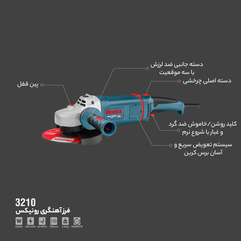 سایر توضیحات ویژگی‌های محصول قطر صفحه 180 میلیمتر دارای توان 2400 وات با کارایی بالا مجهز به دسته جانبی ضد لرزش دسته کلید گردان 180 درجه جهت کار در زوایای مختلف پر قدرت و صنعتی با کارایی بالا مجهز به کلید ضد غبار با کیفیت مطابق استاندارد TUV طراحی منحصر به فرد در قسمت پروانه ای آرمیچر جهت بهبود گردش هوای داخل دستگاه و افزایش عمر مفید موتور استفاده از آرمیچر و بالشتک های صنعتی با بالاترین کیفیت سیم پیچی مطابق با استاندارد CE اروپا دارای قابلیت سافت استارت