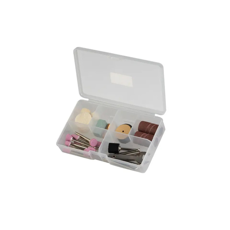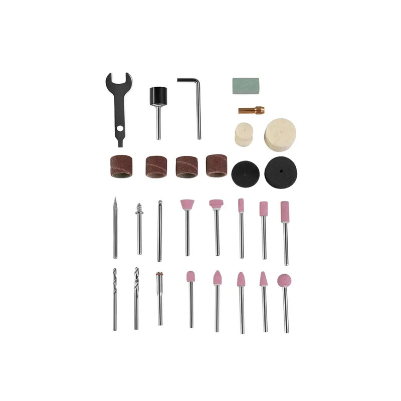 سایر توضیحاتموتور قدرتمند 130 واتی که چرخشی بالغ بر 10000 تا 35000 دور در دقیقه را فراهم می‌کند. - دستگاهی با کارایی بالا،وزن سبک، مناسب برای انجام انواع مختلف عملیات - سرعت قابل تنظیم برای مطابقت با کاربردها و نیازهای مختلف - دربردارنده 40 قطعه سری و متعلقات کاربردی ابزارآلات چرخشی برای انجام فعالیت‌های سنباده‌زنی، برش، سنگ‌زنی، کنده‎کاری، تمیزکاری، پرداخت و ... - سیستم قفل‌کن پین برای تغییر آسان سری و متعلقات کاربردی و افزایش ایمنی کاربر - کولت 3.2 میلیمتری برای مطابقت با سری‌ها و متعلقات مختلف - دارای سری‌ها و متعلقات گوناگون به منظور ایجاد انواع برش و شیار بر روی چوب