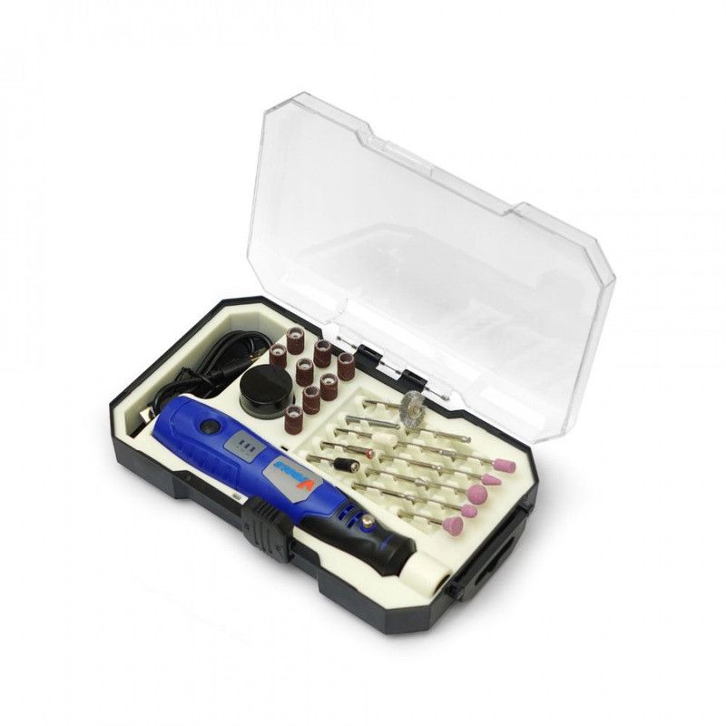 از فرز مینیاتوری جهت کارهای ظریف فرزکاری و با دقت بالا از قبیل مجسمه سازی، تراشکاری و قالب گیری، ساخت کاردستی، ساخت و تولید لوازم دندانپزشکی و.. مورد استفاده قرار میگیرد. این ابزار کاربردی در بازار دارای انواع مختلف همچون دیجیتال و آنالوگ یا بالوازم و بدون لوازم می باشد.فرز انگشتی مینیاتوری شارژی وی تولزمدل VT1212یکی از این نوع فرزها میباشد که دارای ابزارهای متنوعی جهت برش ، سایش ، پرداخت ، ساب انواع سطوح میباشد. فرز مینیاتوری شارژی وی تولز دستگاهی عالی برای کارهای ظریف است و از آن میتوان در موارد بسیاری مانند کاشت ناخن، ساخت زیورآلات، صنایع دستی و غیره استفاده کرد. این فرز مینیاتوری 3.6 ولت دارای سه سرعت 5، 12 و 18 هزار دور در دقیقه است که به شما انتخاب سرعت چرخش مناسب را میدهد. استفاده از این دستگاه بسیار راحت است و با فشار یک دکمه میتوانید آن را روشن و خاموش کنید و سرعتش را تغییر دهید. طراحی ارگونومیک و سبک بدنه باعث میشود مانند یک قلم، راحت بتوانید از آن استفاده کنید. موتور با کیفیت مسی این دستگاه سبب افزایش قدرت، چرخش نرم و عمر طولانی آن شده است. لوازم جانبی این دستگاه شامل 40 سری متنوع میشود که امکان ساخت هرنوع صنایع دستی و یا پروژه خانگی را برایتان فراهم میآورد. طراحی زیبا و کاربردی این دستگاه به گونهای است که هر سری جای مخصوص خود را دارد، در نتیجه میتوانید به راحتی آنها را پیدا کنید، آنها را منظم بچینید و بدون دردسر حمل کنید. با این بستهبندی دیگر لازم نیست نگران گم شدن سریهای دستگاه باشید. این پکیج جذاب برای ساخت صنایع دستی و کارهای هنری عالی است و تا سالها میتواند دستیار شما هنرمندان عزیز باشد.